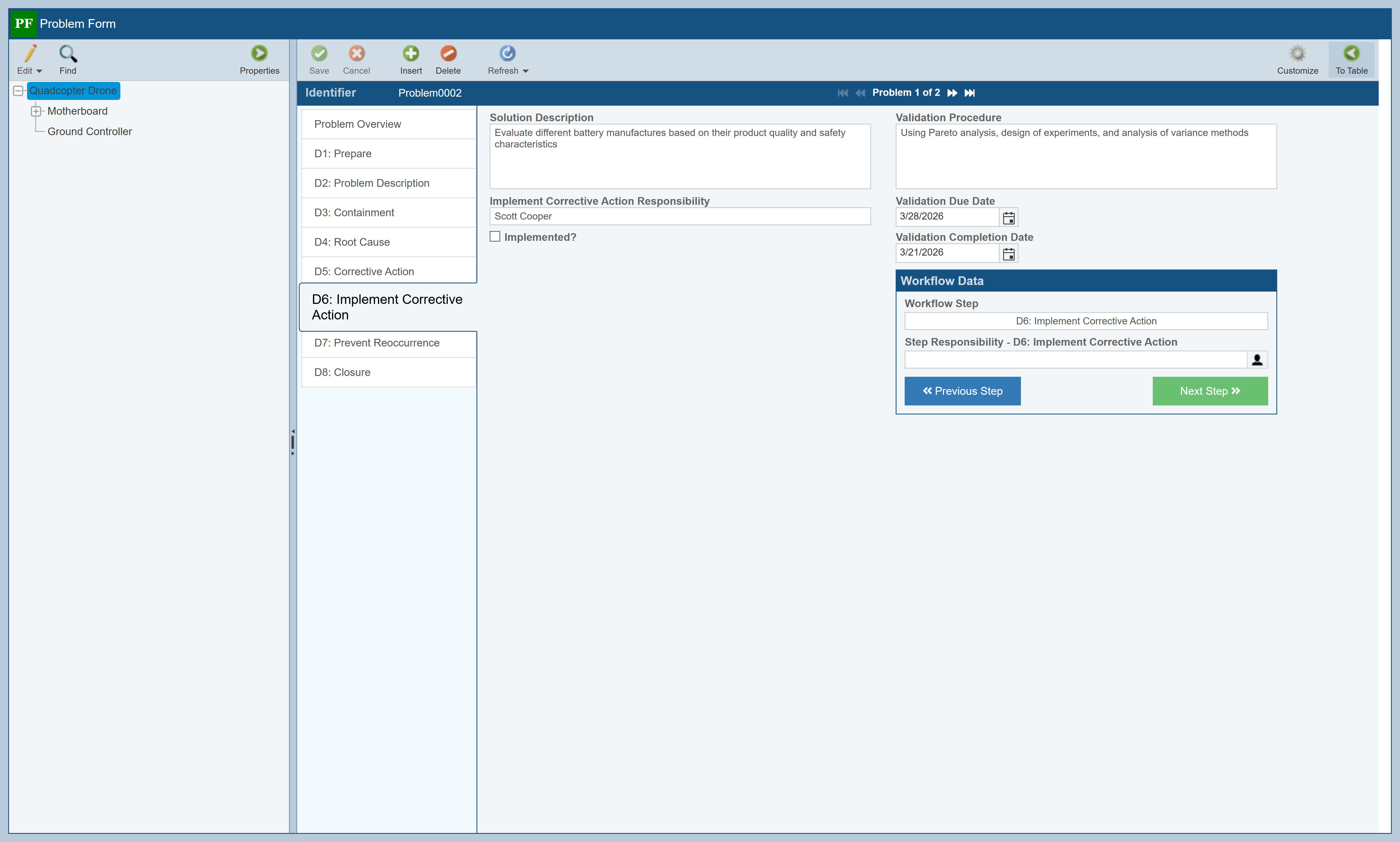 You can navigate through the data for each Problem using the navigation buttons just as with Incident Forms. Notice that as you navigate through the Problem Forms, you are automatically taken to the appropriate form for whatever step in the Problem workflow you are currently on. This Example uses the common 8D process for Problem resolution, and you can see how the various Problems are progressing through the workflow. You can click on any of the tabs on the left side of the Problem Form to review the data associated with each step.