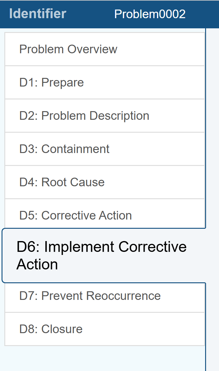 Problems are used in order to track critical issues through a fully closed-loop corrective action process such as 8D, DMAIC or PDCA. Problems can also be a mechanism to allow you to group Incidents together; this enables you to track Incidents with common underlying causes or corrective actions together for more efficient tracking. In this Example, the Problems are defined based on the commonly used FRACAS 8D process. When an Incident, or a group of Incidents, is elevated to a Problem, a specific process is put into place to define, control, and ensure corrective action is completed.