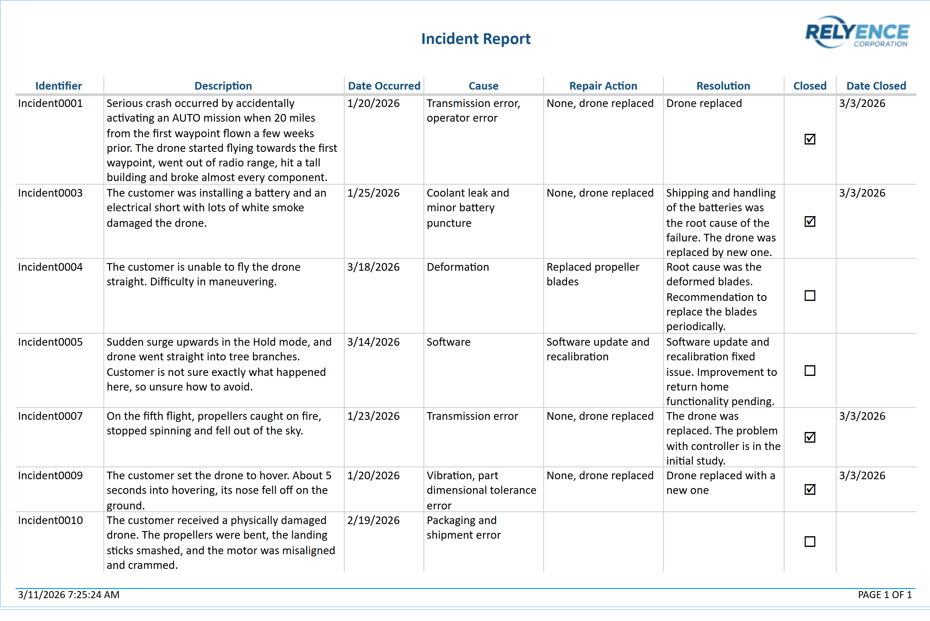 Description: The customer was flying the drone and something caused it to return to the take-off point. It landed hard and damaged the landing pads. Notice that once you press Tab after entering the Description, the Identifier is automatically filled in for you. Relyence FRACAS automatically generates the Identifiers for your Incidents and Problems. You can customize the autonumbering if you would like under Properties in the Sidebar. For more information on Incident and Problem Identifier autonumbering customization, refer to details in the Customizing Incident and Problem Identifier Autonumbering section in the FRACAS Properties topic.