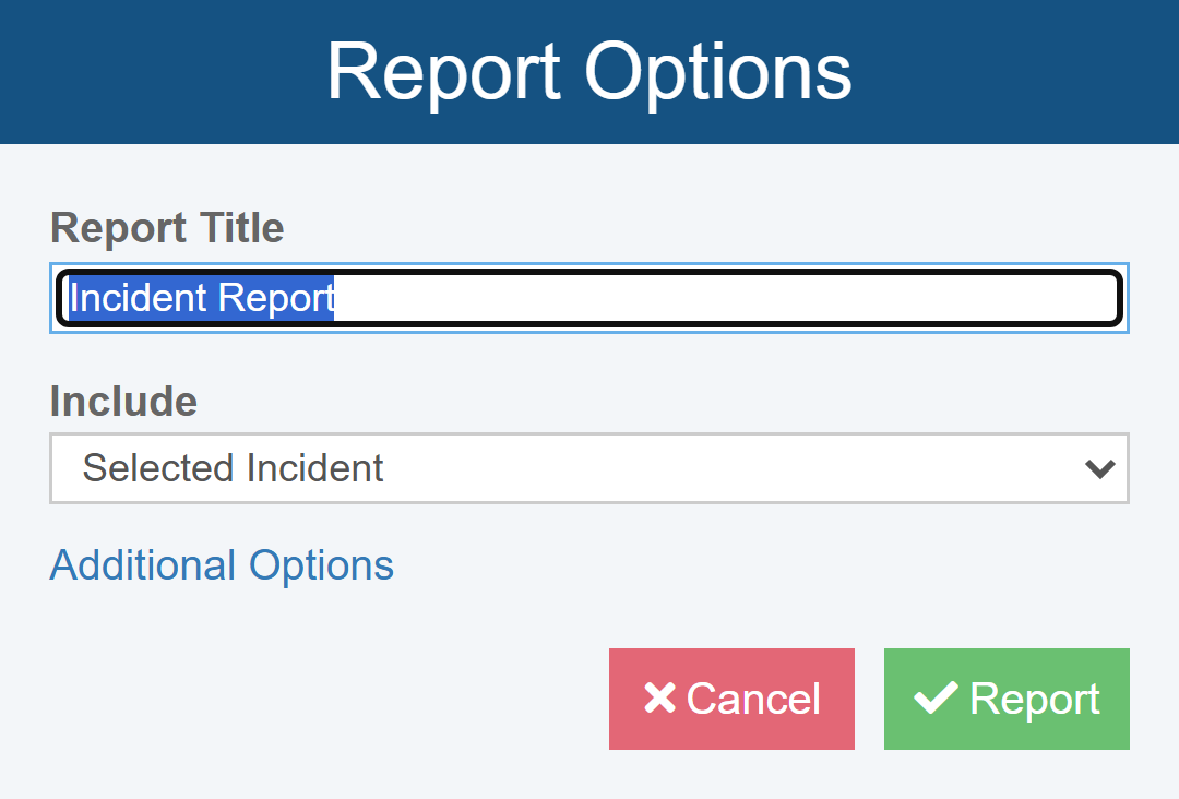Click Report in the Sidebar. The Report Options dialog for the Incident Form appears.