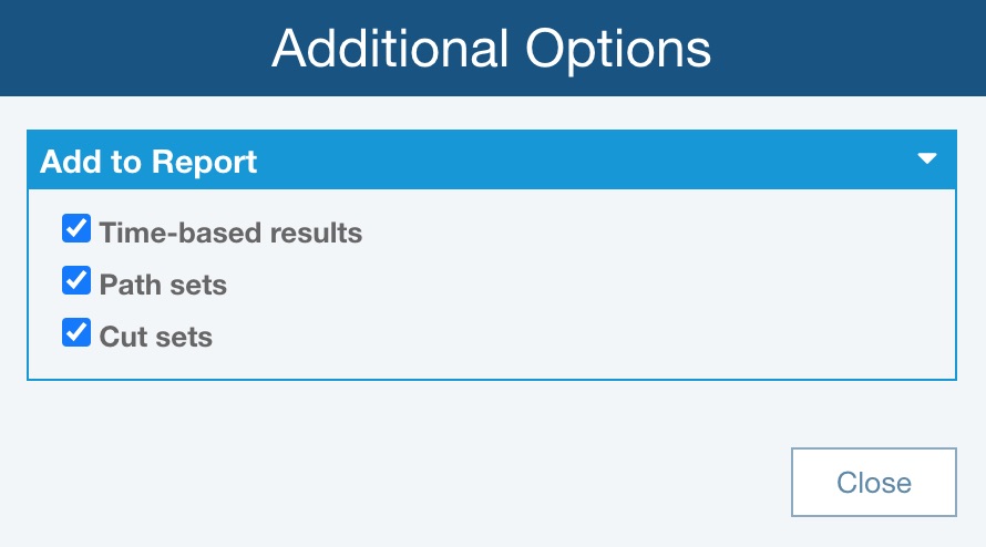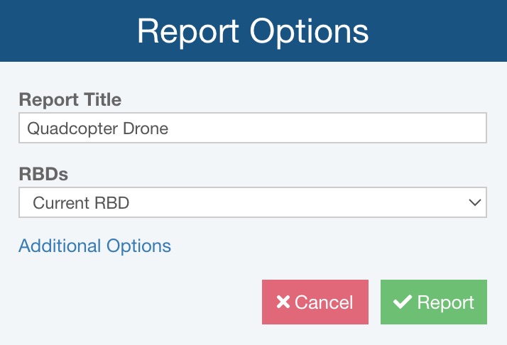 To generate a report of your RBD, make sure the RBD pane is selected and click Report from the Sidebar. The Report Options dialog appears.