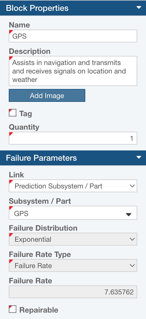 Failure Distribution and associated parameters: If unlinked, you must enter the failure characteristics of the block. The failure parameters consist of the Failure Distribution and the corresponding distribution parameters. For more information about the failure distributions and the associated parameters, refer to the Failure and Repair Distributions topic. Because we are linking to the GPS in our Reliability Prediction, these fields are disabled.