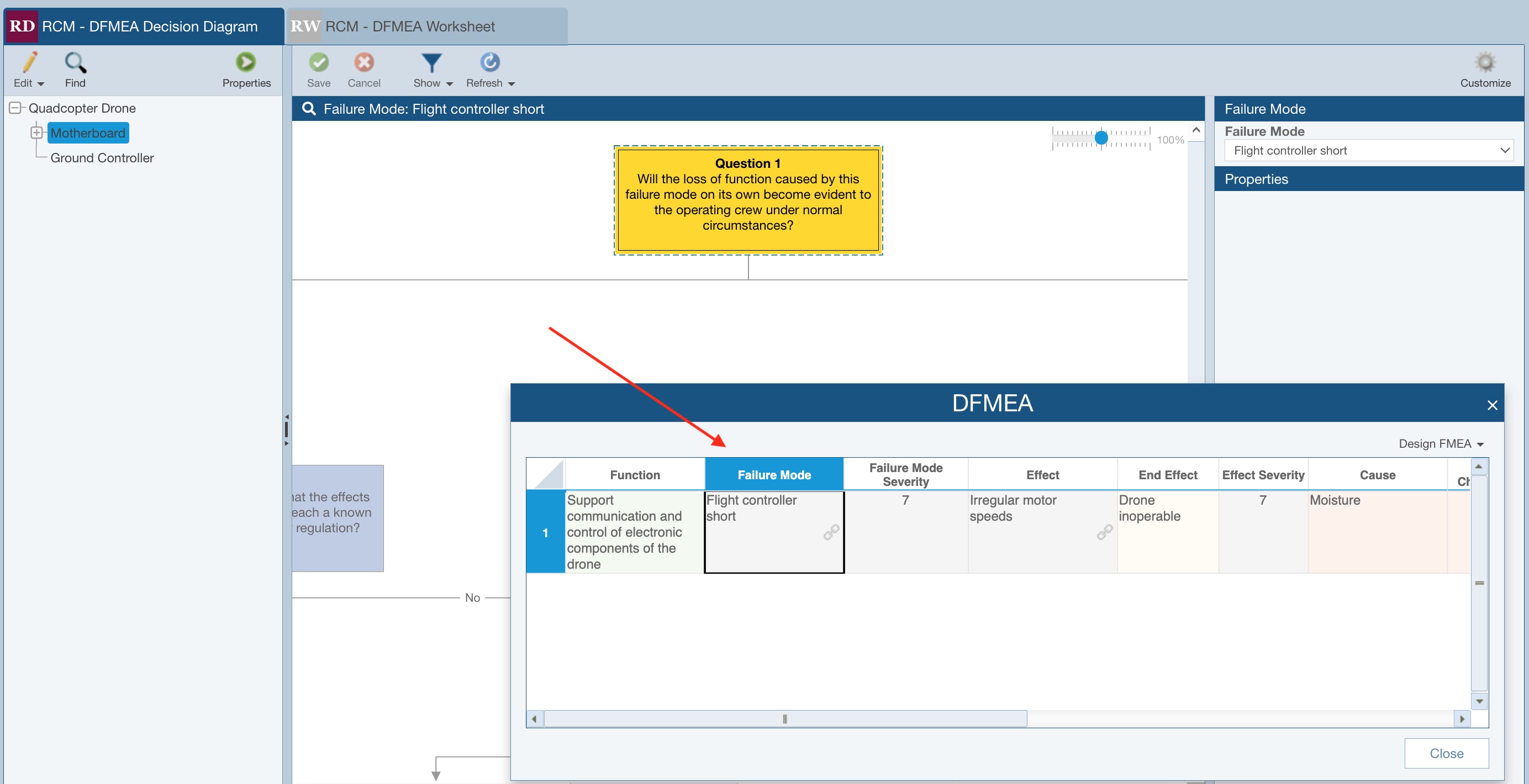 Click the RCM - DFMEA Decision Diagram tab to select the Decision Diagram. Click the Failure Mode dropdown list to see the list of Failure Modes identified in the Drone Example FMEA for the Motherboard.
