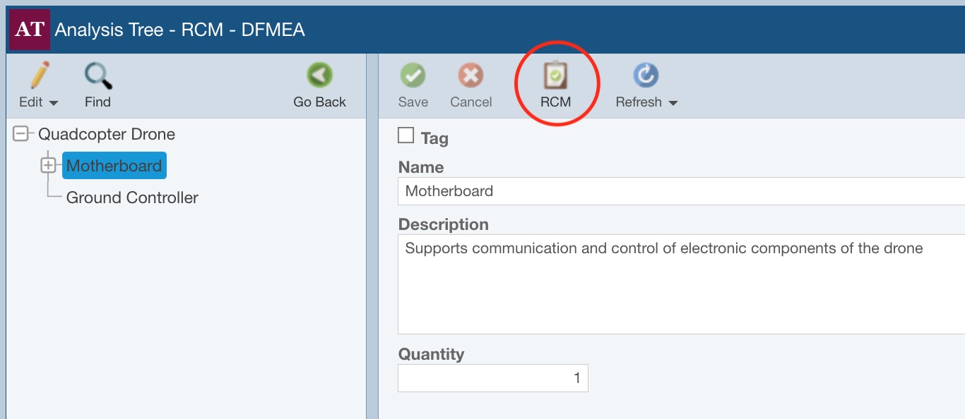 In our Drone Example, we have performed RCM analysis for several items of our Analysis Tree, but not the Motherboard. Now, we have made the decision to perform an RCM analysis on the Motherboard. To enable RCM analysis for the Motherboard, click Motherboard in the Analysis Tree pane to select it. Then click Properties in the Analysis Tree toolbar to view the Properties of the Motherboard.