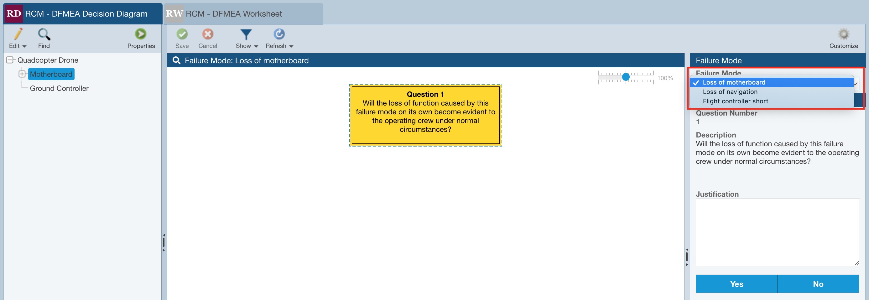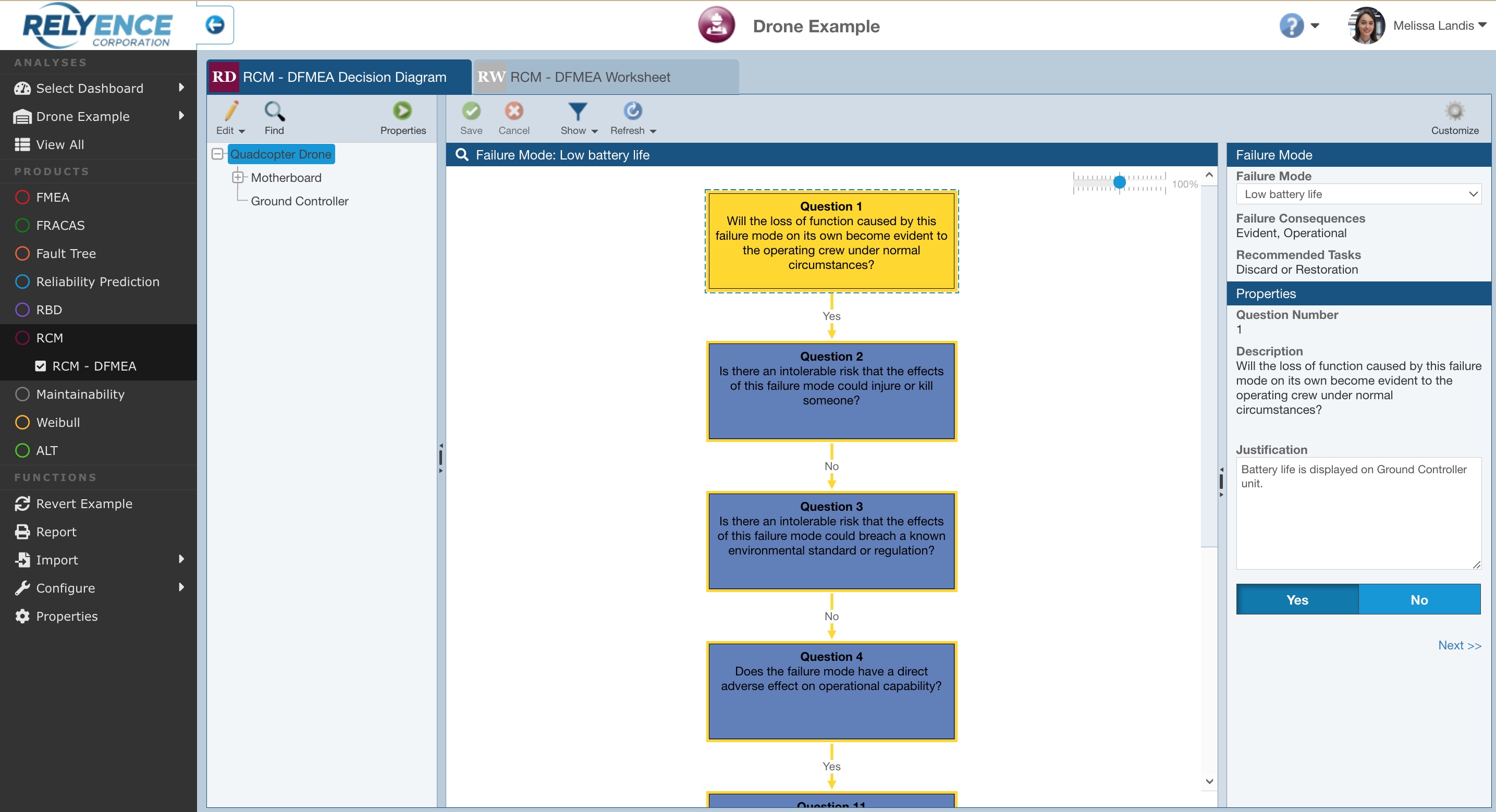 Both the Decision Diagram and RCM Worksheet are customizable. The Drone Example uses some of the built-in RCM templates supplied with Relyence RCM. You can modify the supplied templates or create your own unique ones, see the Customizing the RCM Data Views section of this guide for more information.