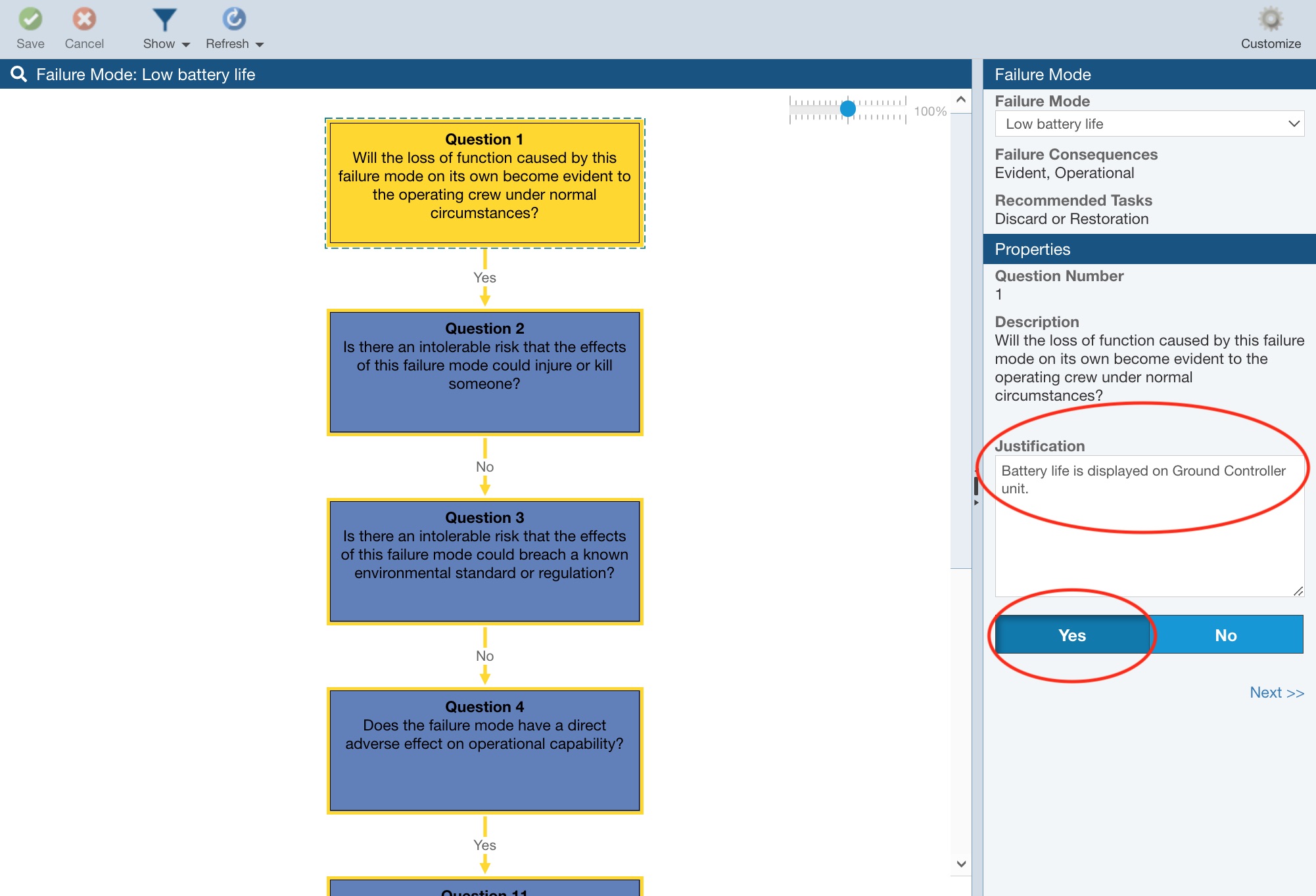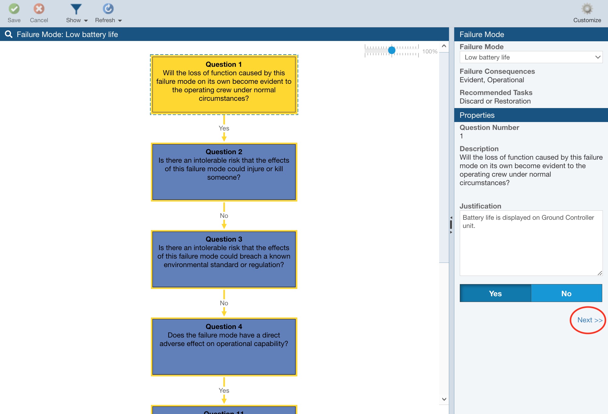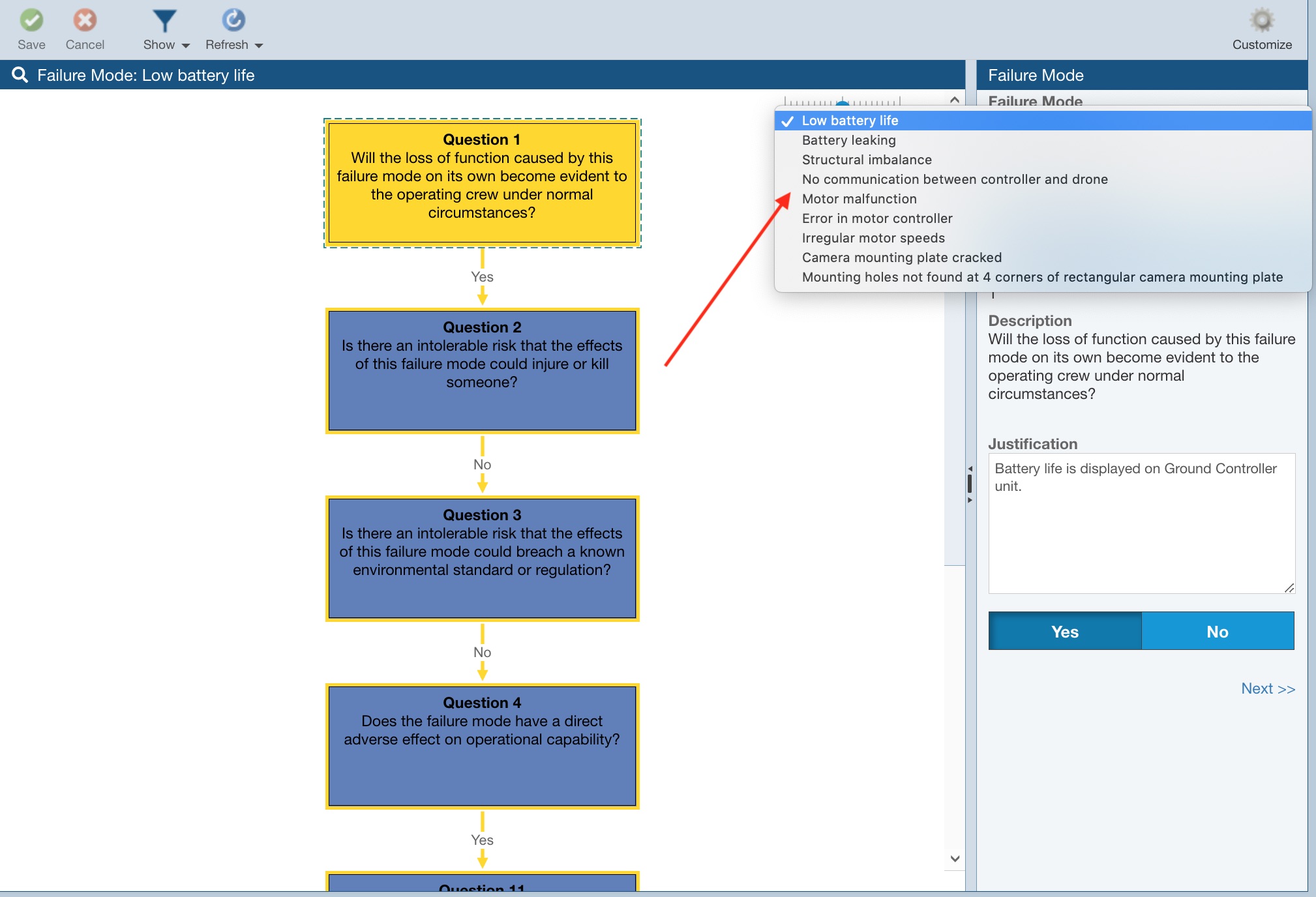 Select Show>Selection Only for the Low battery life Failure Mode. Click Next>> and review the series of Questions and Answers and noted Justifications. Note that the end result is to periodically replace the battery to avoid a battery failure and mitigate the probability of a damaged drone.