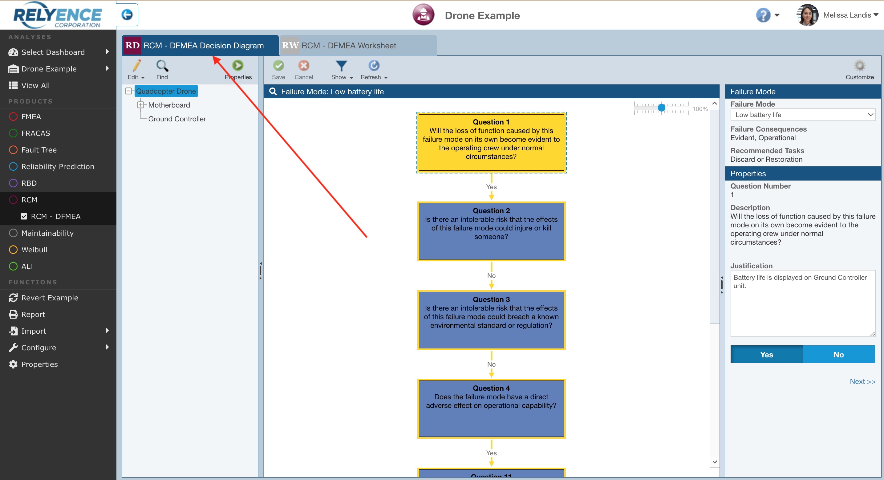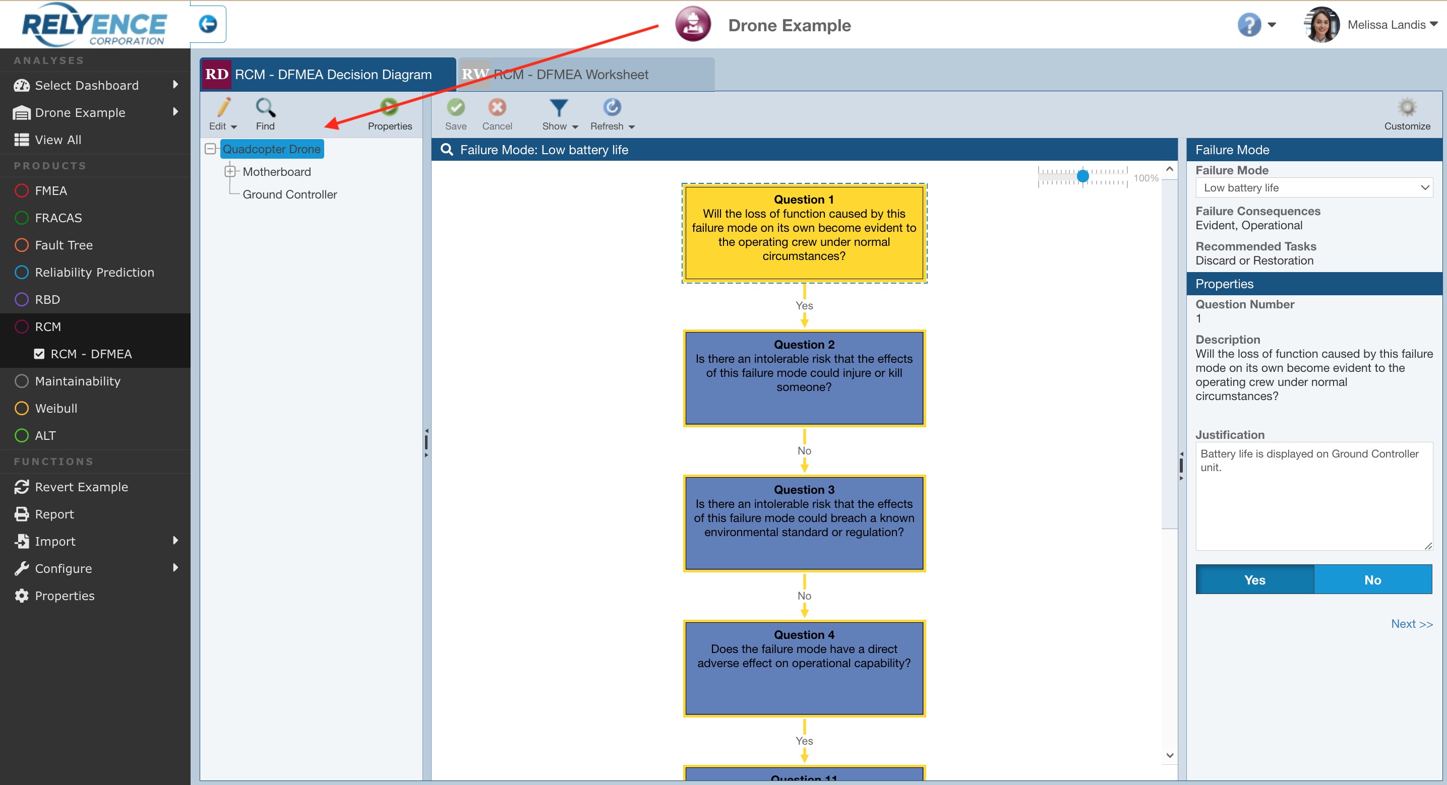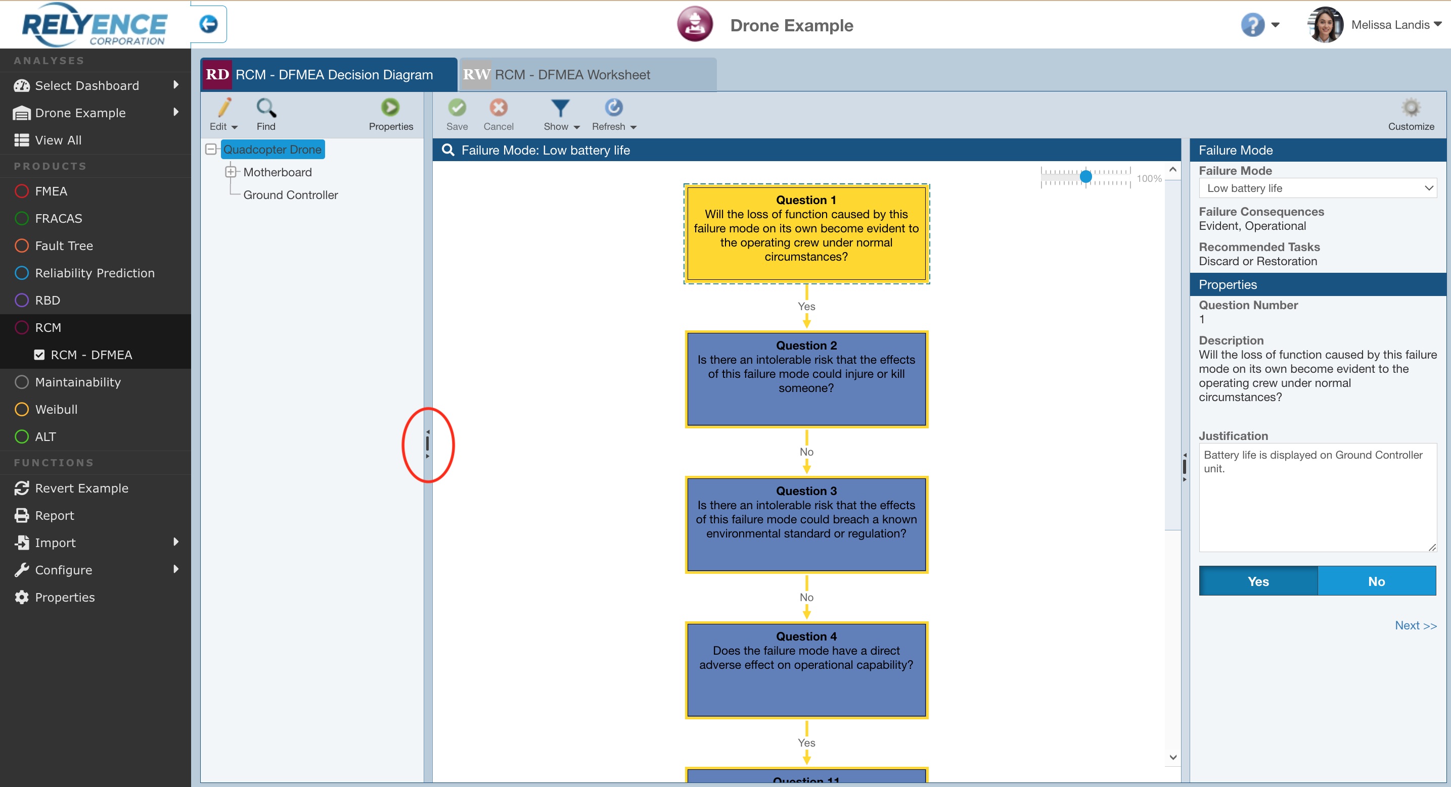 Select Show>Selection Only for the Low battery life Failure Mode. Click Next>> and review the series of Questions and Answers and noted Justifications. Note that the end result is to periodically replace the battery to avoid a battery failure and mitigate the probability of a damaged drone.