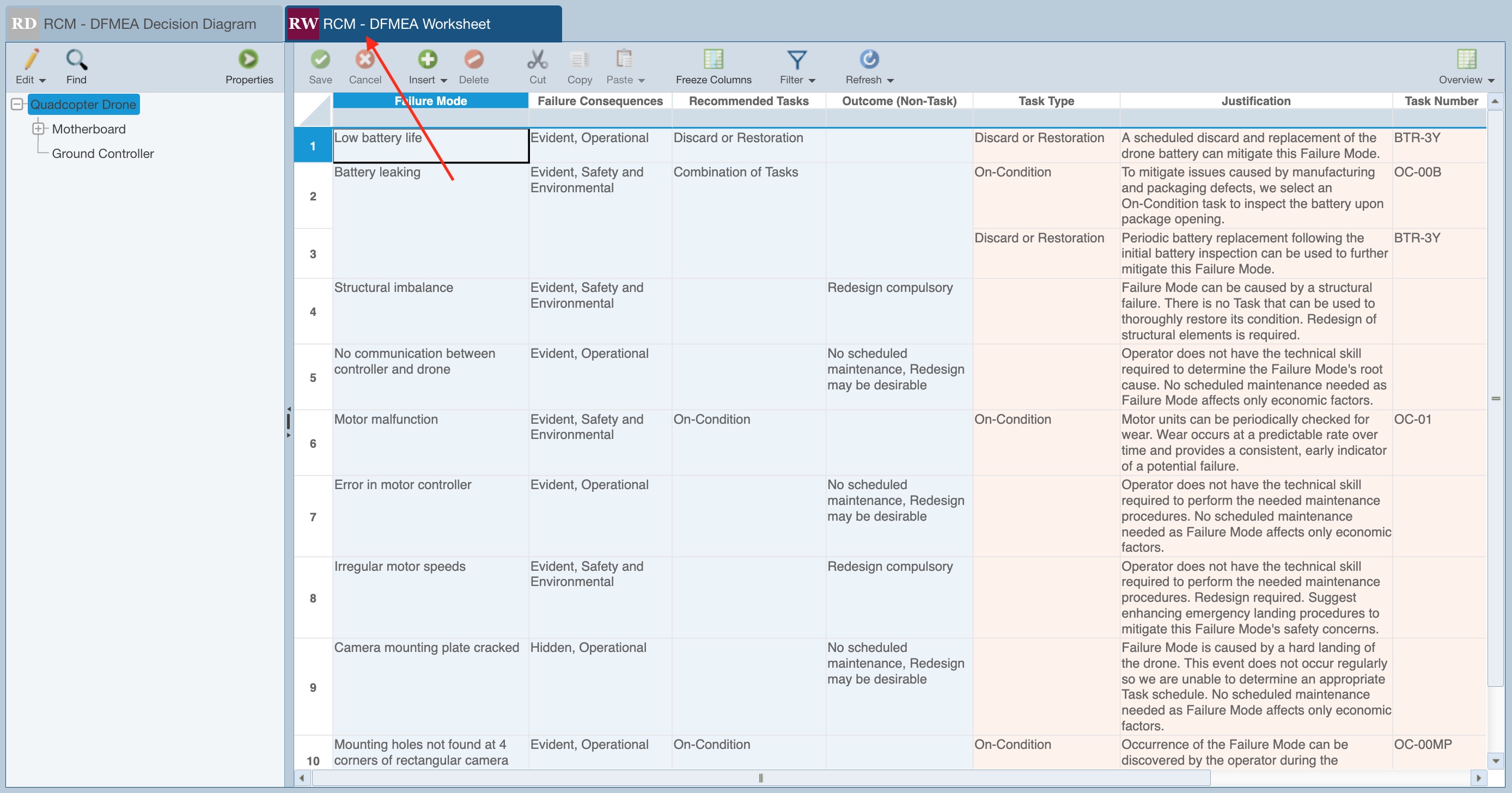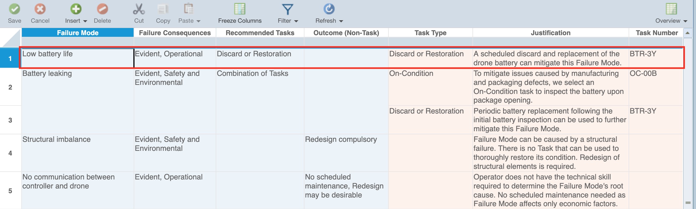 You can view the Task information entered for the Low battery life Failure Mode. You can see that the end result for the Low battery life Failure Mode is to periodically replace the battery to avoid a battery failure and mitigate the probability of a damaged drone.