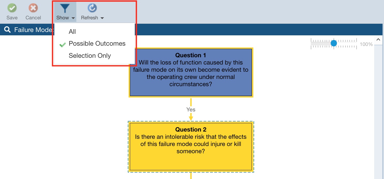 You can also choose to filter your Decision Diagram for viewing. There are three options for viewing the Decision Diagram. Click the Show icon in the RCM pane toolbar to see the selections of All, Possible Outcomes, or Selection Only.