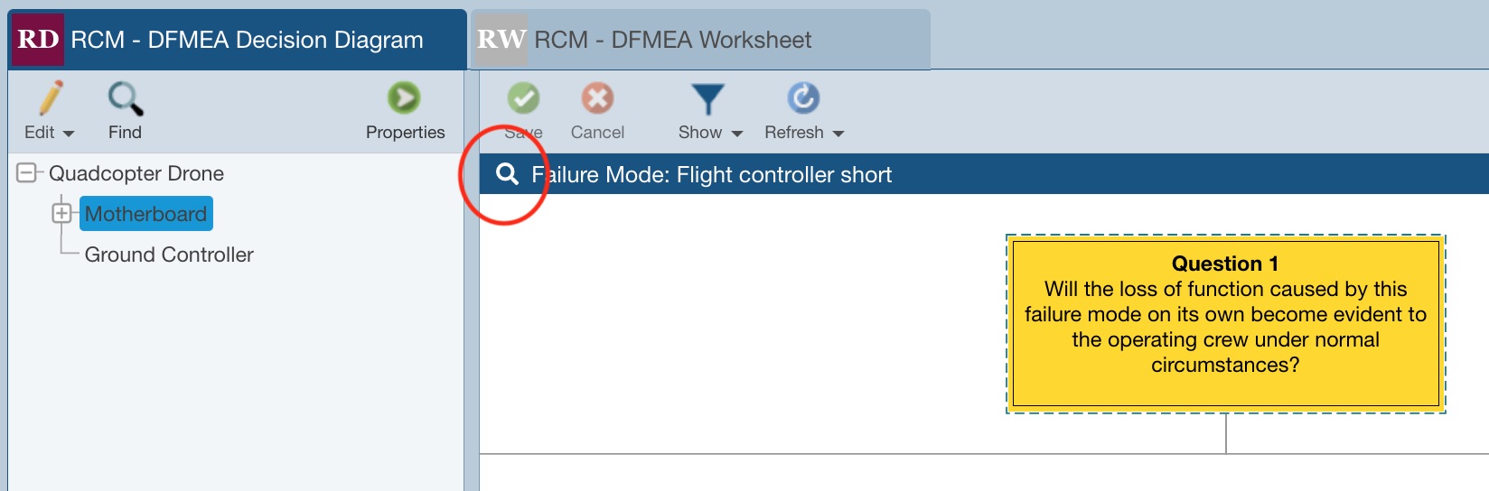 For this example, we will step through the RCM process for one of the 3 Failure Modes - the Flight controller short. To do so, first click the Show icon and select the Possible Outcomes option. Then, select Flight controller short from the Failure Mode dropdown list.