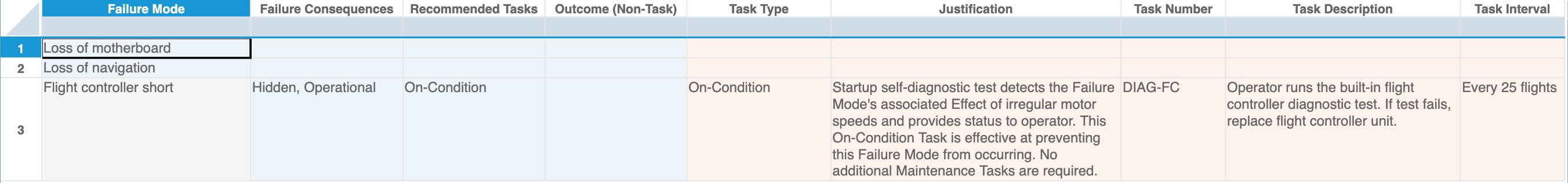 Now that the Decision Diagram is complete, we will move to the RCM Worksheet to complete the information regarding the maintenance plan for the Flight controller short Failure Mode.