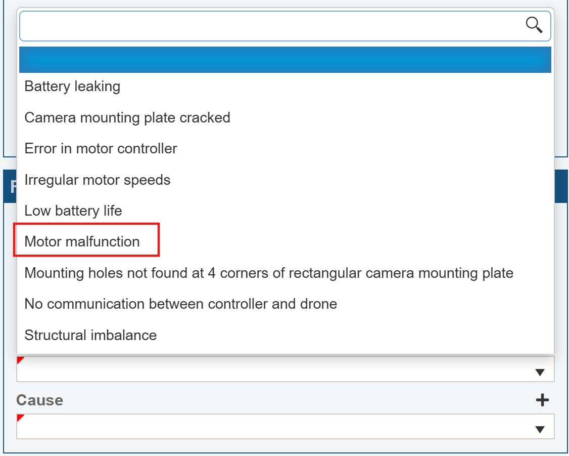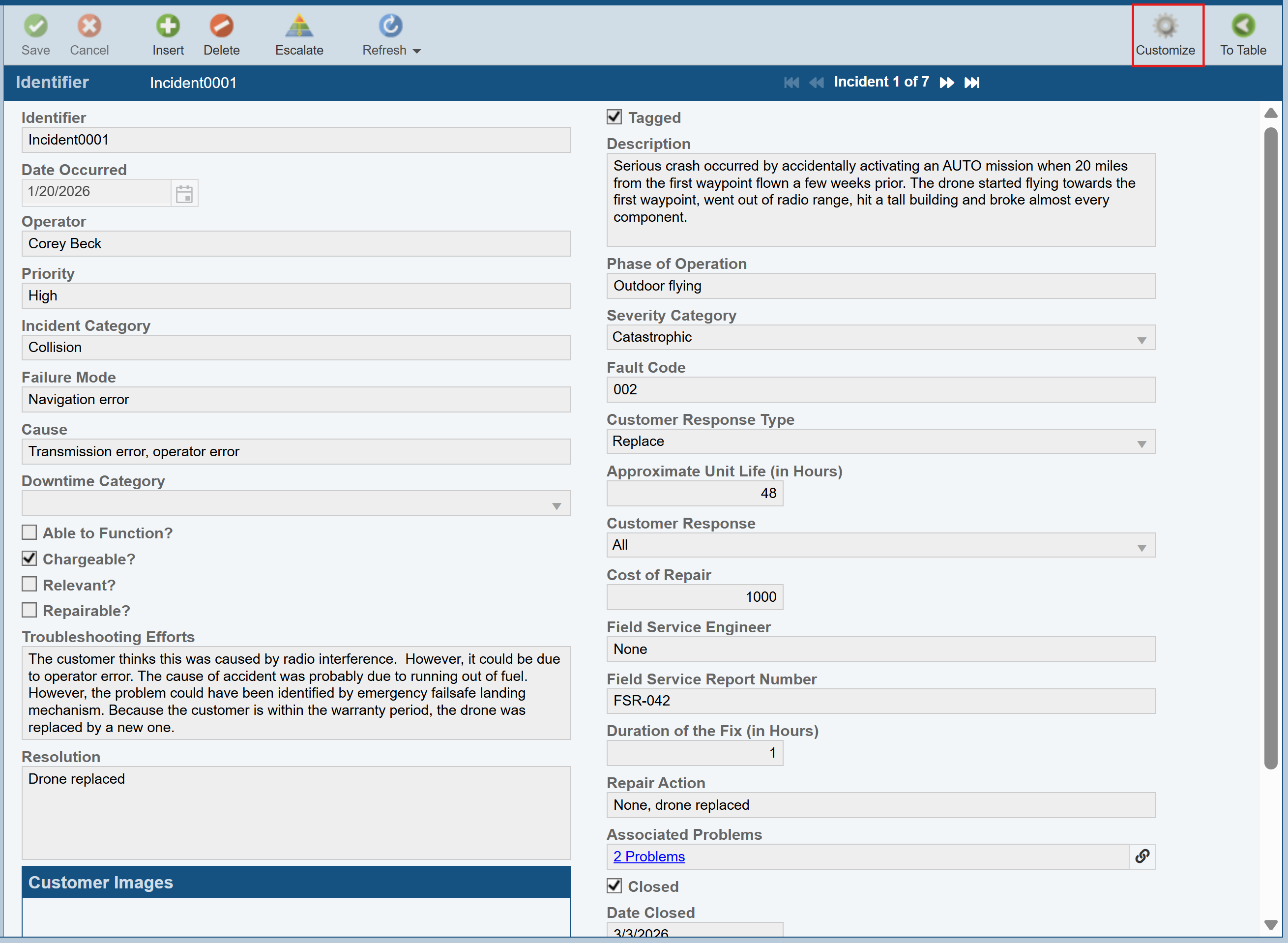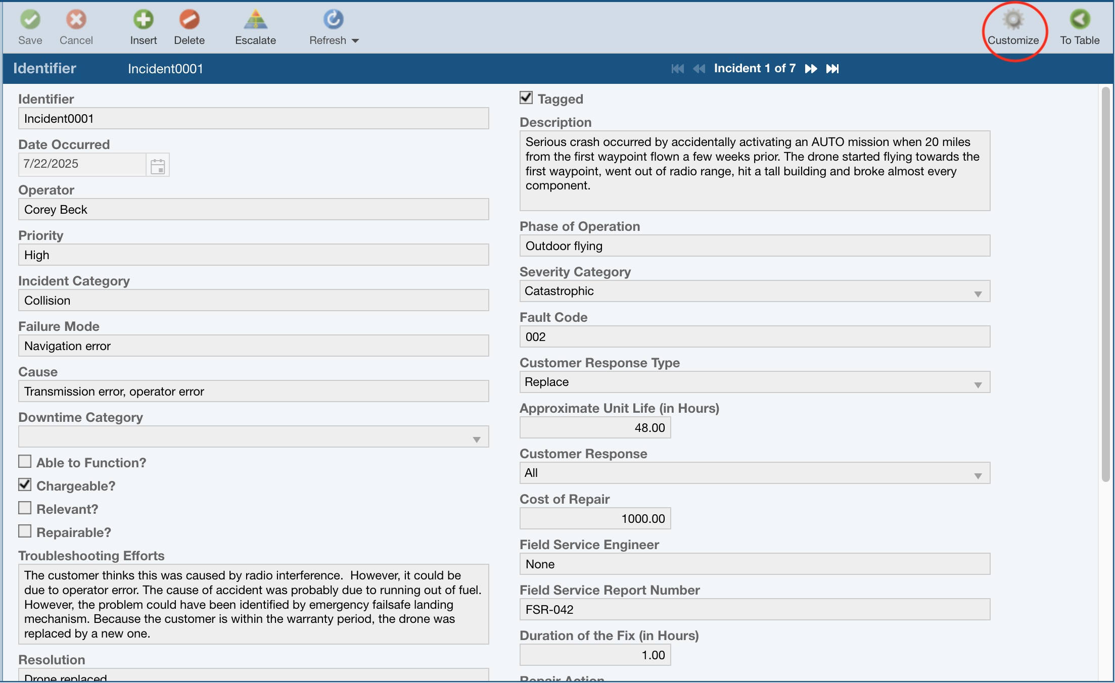 Now, let's assume we have two new Incidents that have been reported that we need to log. One customer reported a motor malfunction in his drone; another reported that the landing gear collapsed upon landing.