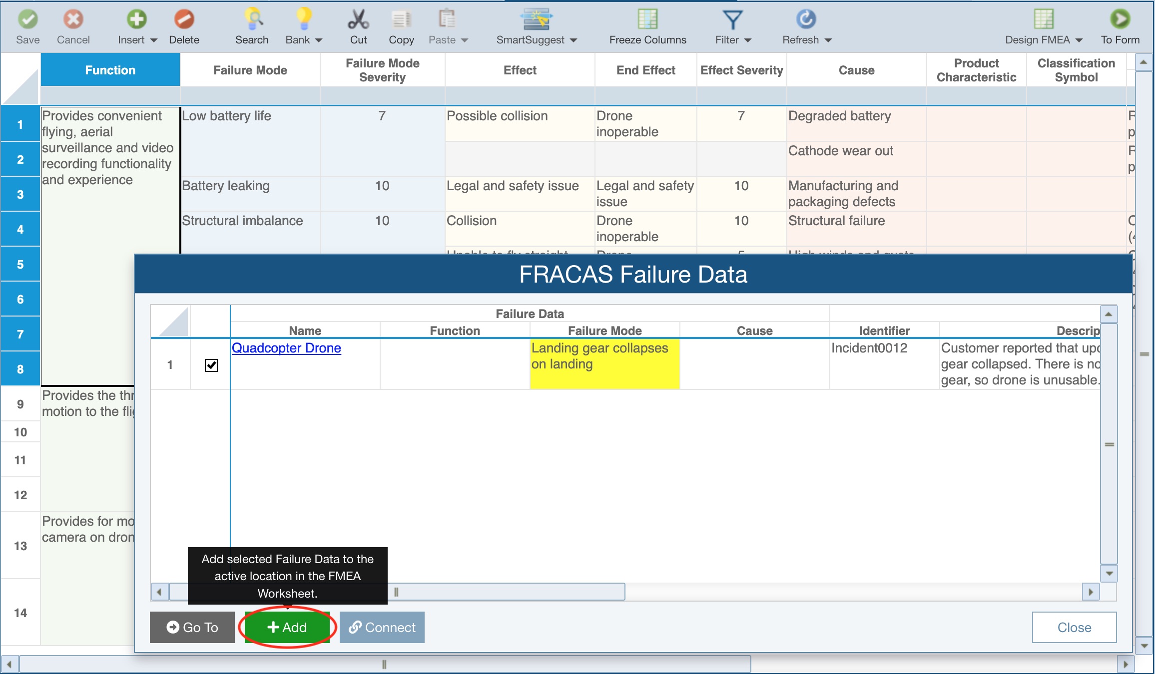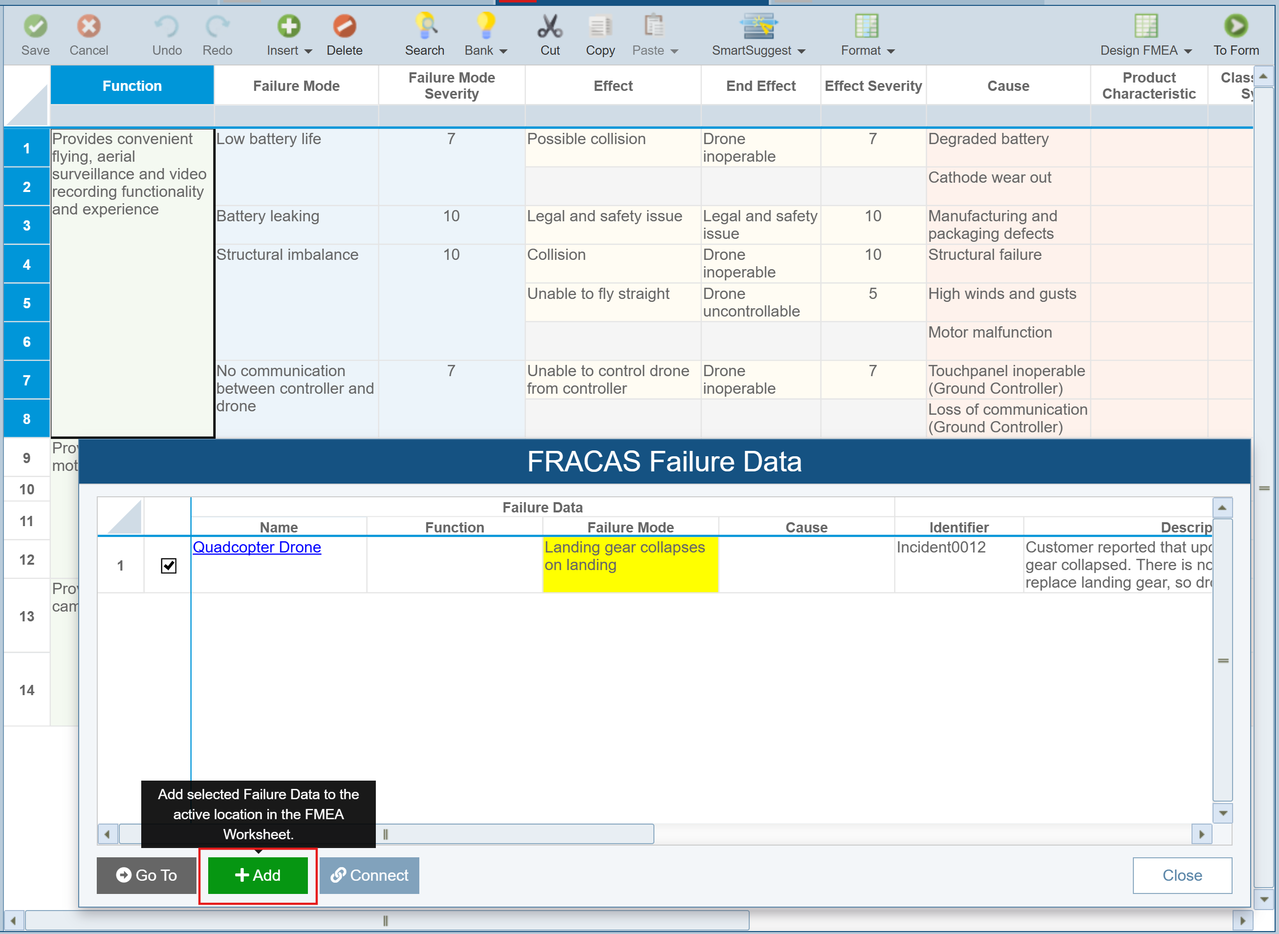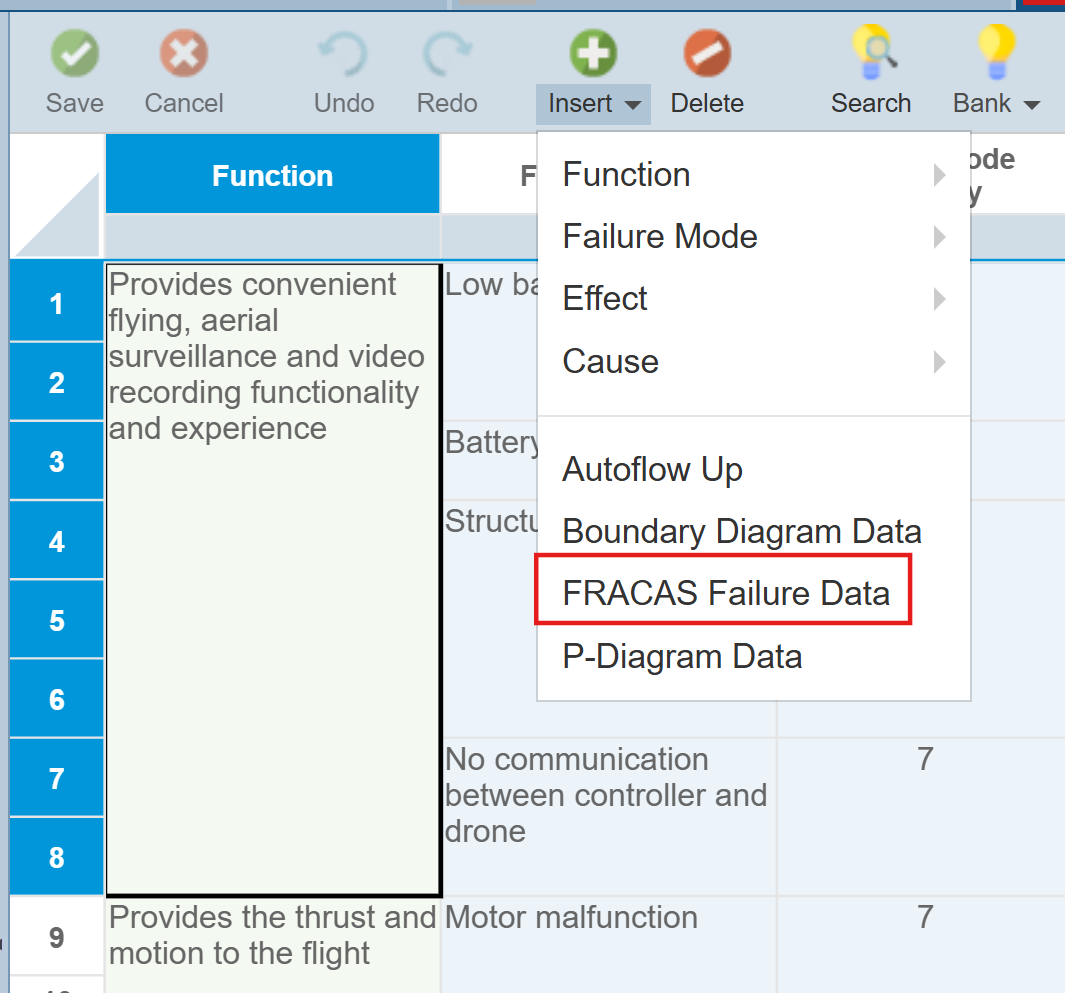 In the DFMEA Worksheet, from the toolbar, click Insert>FRACAS Failure Data.