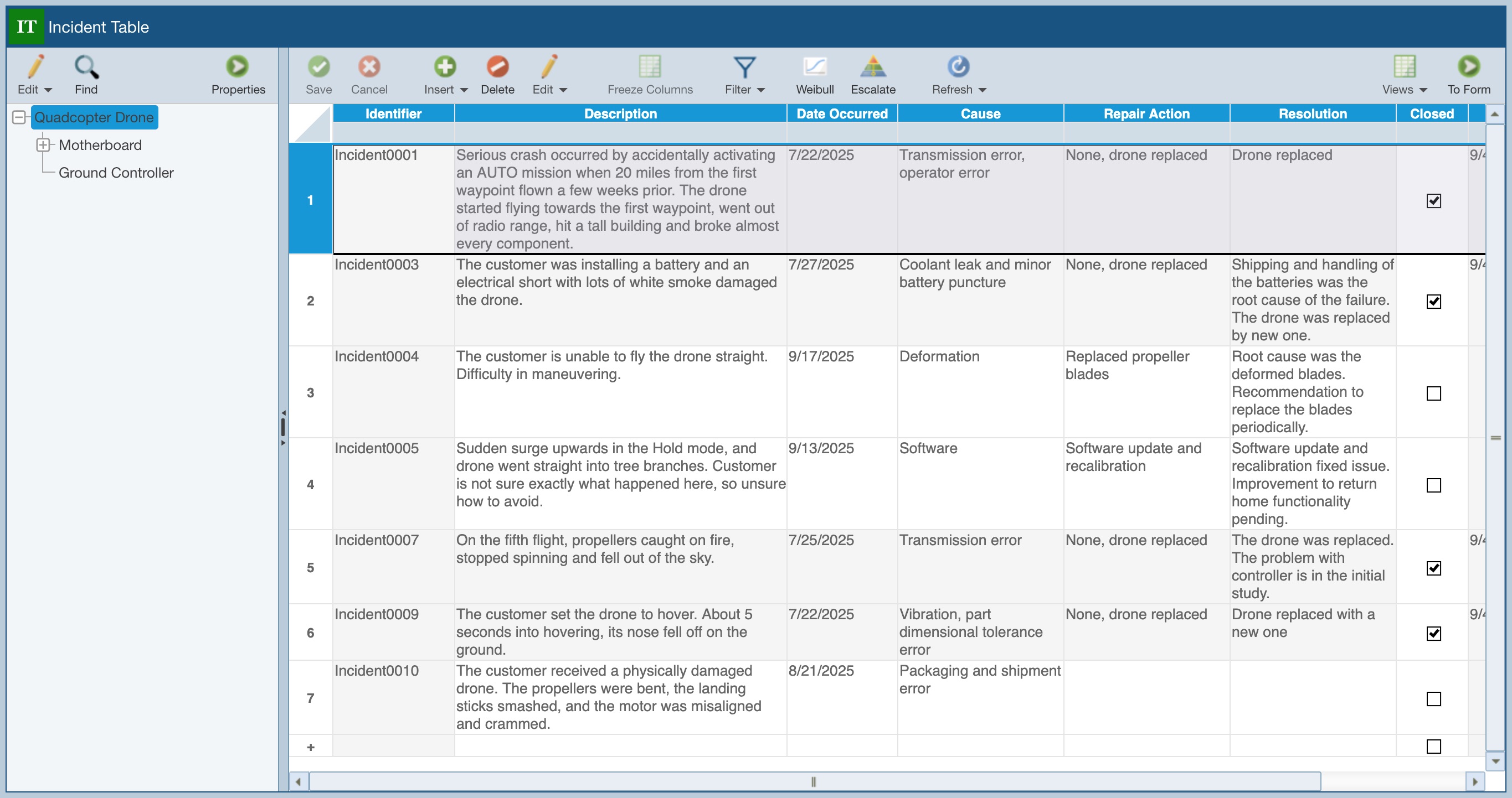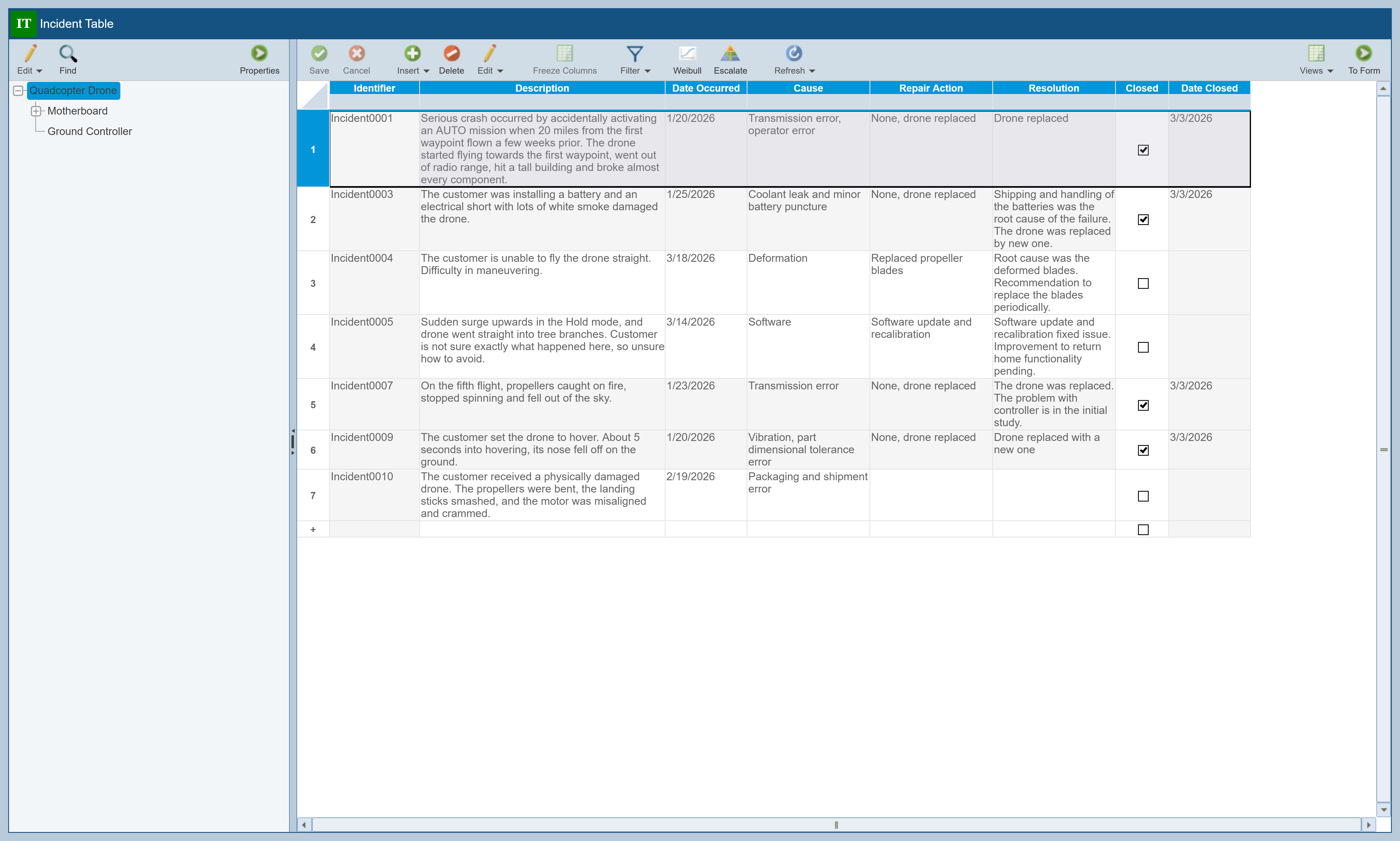 The Incident Table displays a list of all the Incidents logged to date associated with the item selected in the Analysis Tree. In this case, the Incidents associated with the Quadcopter Drone are displayed.