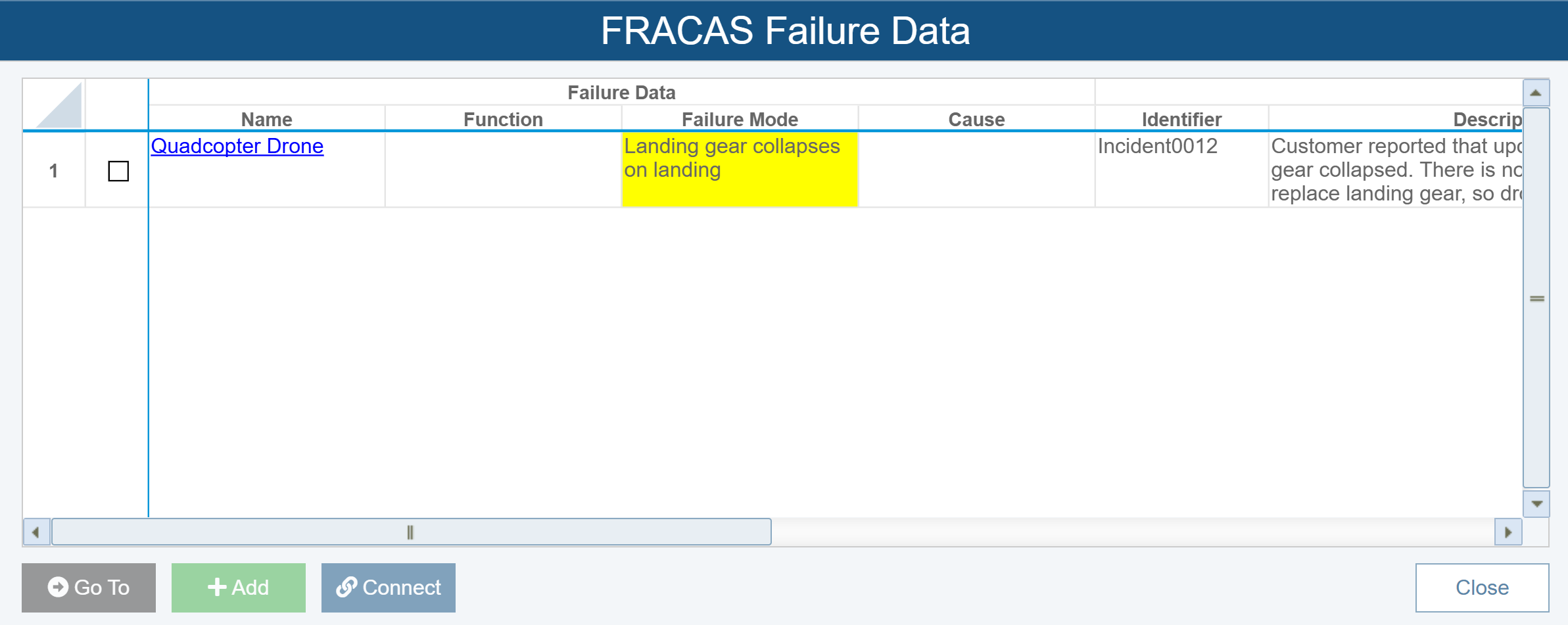 At this point, the Quadcopter Drone should be selected in the Analysis Tree and the Function "Provides convenient flying, aerial surveillance and video recording functionality and experience" selected in the Worksheet. If you were not at the appropriate location to add this data, you can select the checkbox for this item in the Table and click to Go To button navigate to it. Or, you can also use the hyperlinks that appear in the FRACAS Failure Data Table to navigate to the correct location.