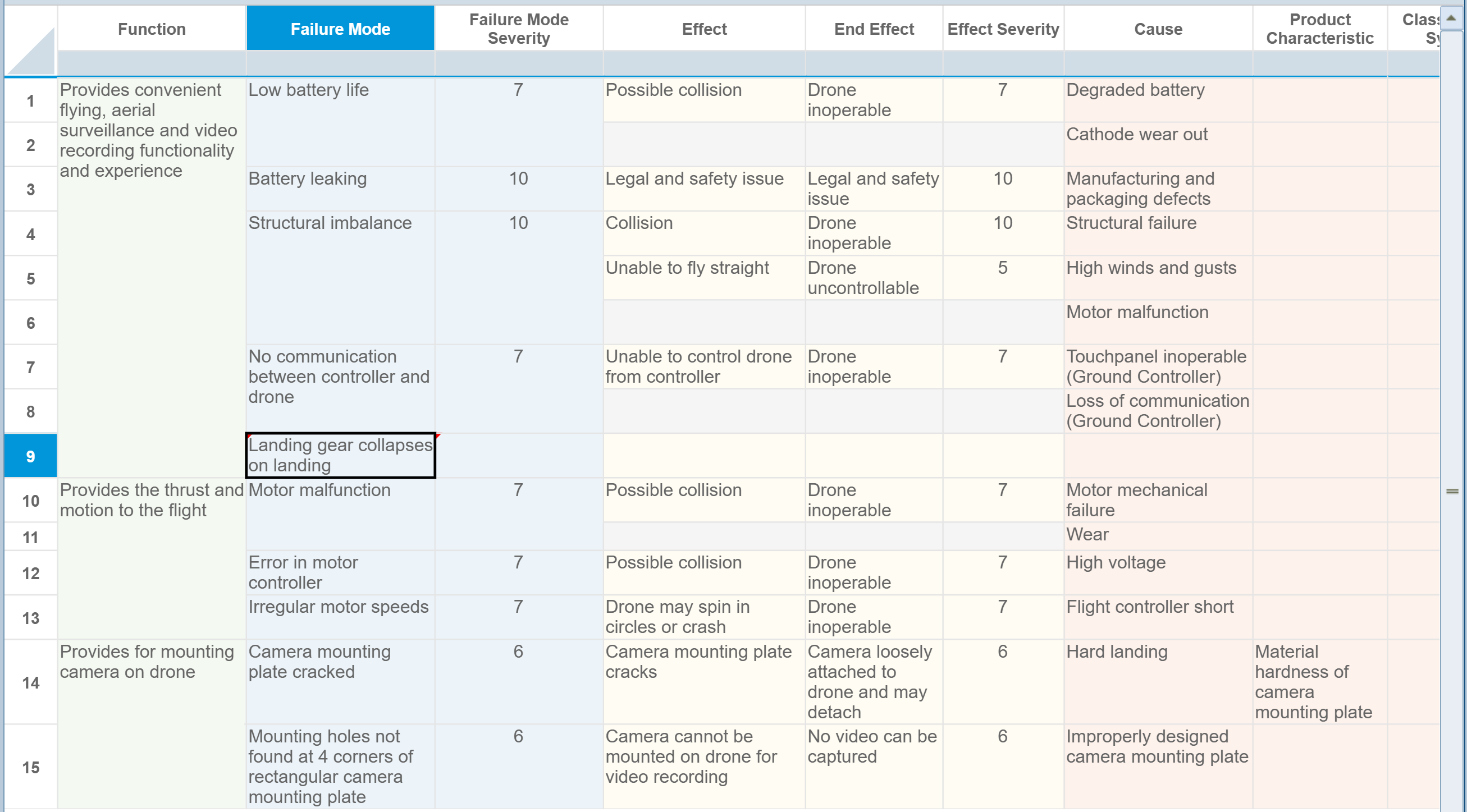 Because the FRACAS team did not select a Function for this Failure Mode, we can choose the Function in the Worksheet to add this new Failure Mode to. In this case, the first Function "Provides convenient flying, aerial surveillance and video recording functionality and experience" is where we want to add this new Mode. If we had wanted to add it to the second Function "Provides thrust and motion to the flight", we would simply select that Function in the FMEA Worksheet so it is the active location.
