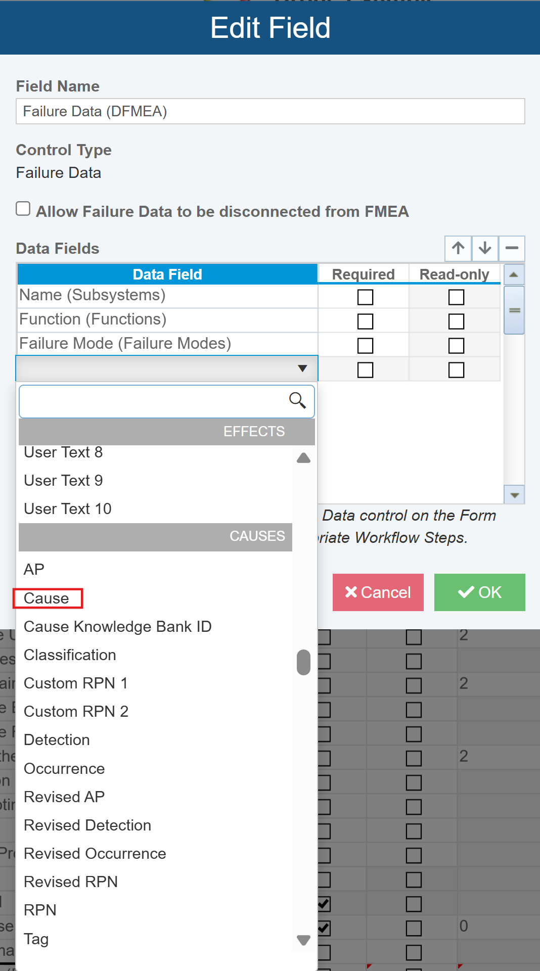 For this tutorial, we are going to add the Cause field to the widget. Go to the last line in the Data Fields table and click in the Data Field column and click the dropdown arrow to bring up the list of available FMEA data fields. Select Cause from the list and press Tab.