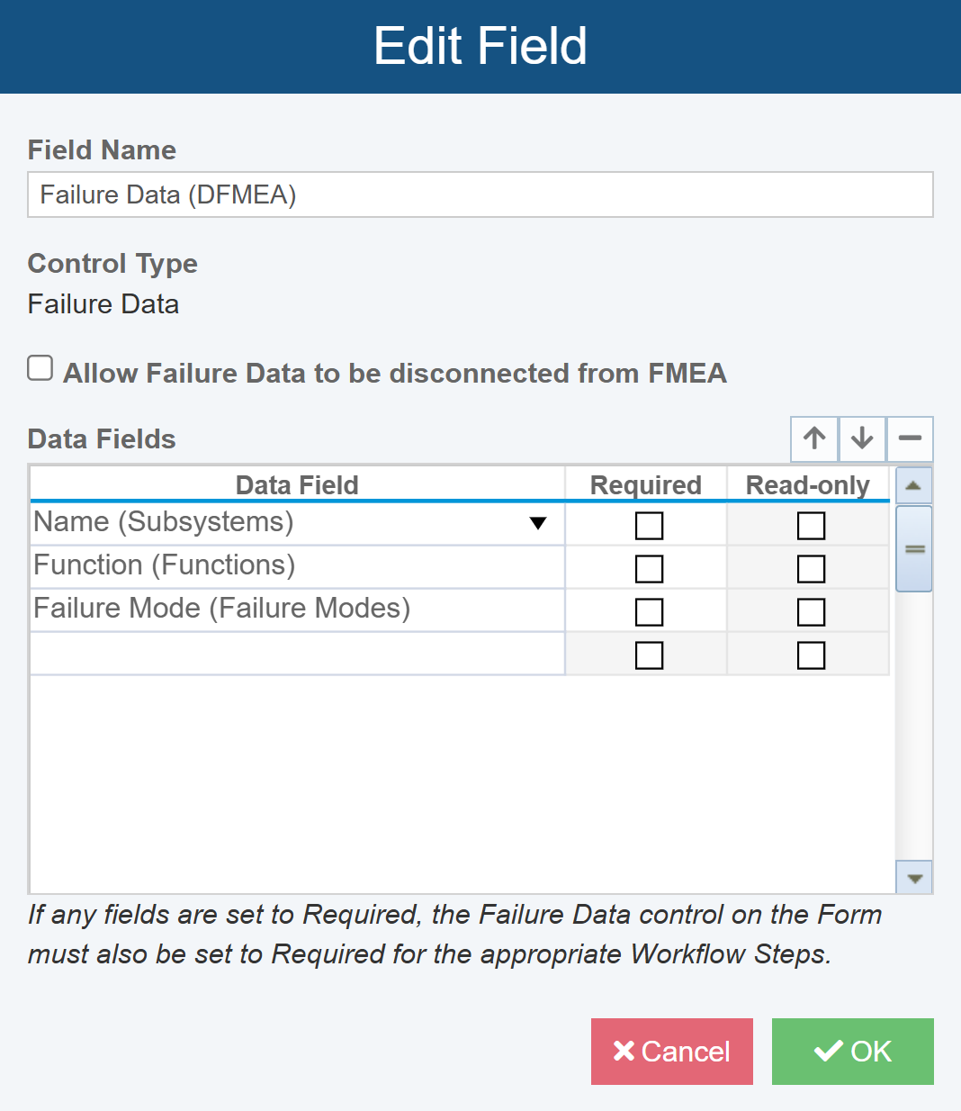 The Edit Field dialog enables you to fully customize the Failure Data widget for your needs. By default, the widget includes the Subsystem Name, Function, and Failure Mode data fields. These data fields represent data from the DFMEA Worksheet. When these fields appear on the FRACAS Form, they will display a list of these items from the DFMEA Worksheet in this Analysis. For further details about customizing the Failure Data widget, see the Customizing Failure Direct Connect topic.