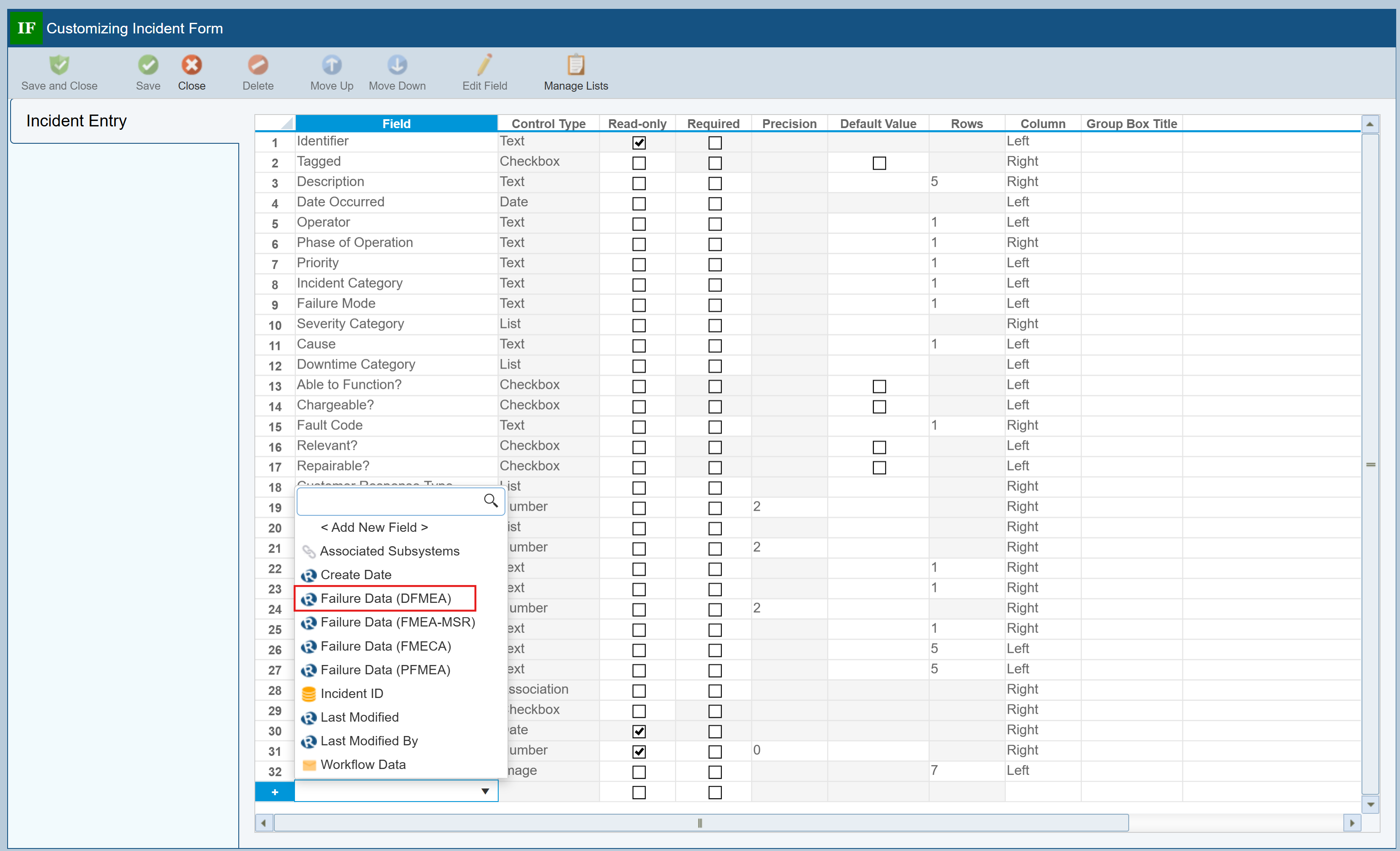 The Failure Data widget is customizable. To set up the widget the way we want, click in the Control Type column for the Failure Data (DFMEA) field and click the Edit Field button in the toolbar.