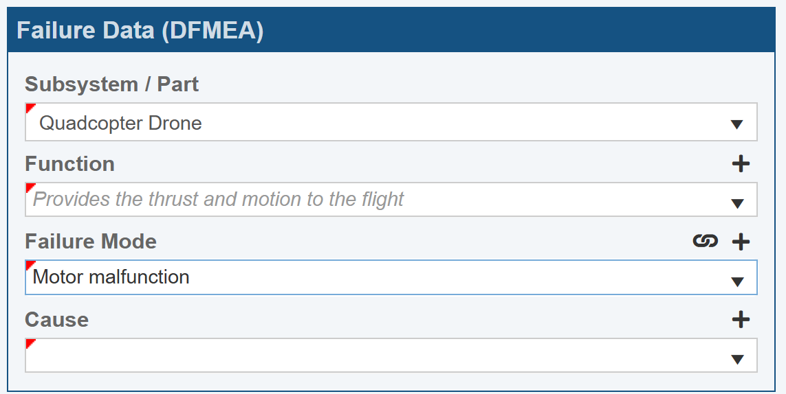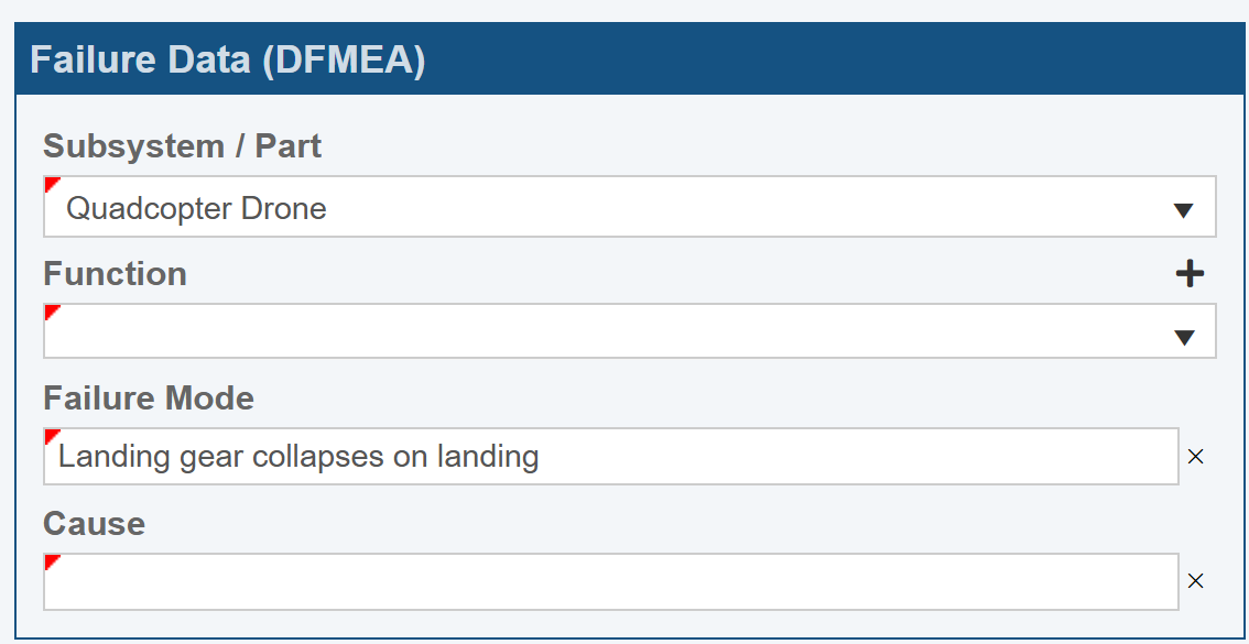 Once selected, the Function is automatically filled in based on the FMEA data. Also, at this point, we don't know the Cause, so we'll leave it blank for now.