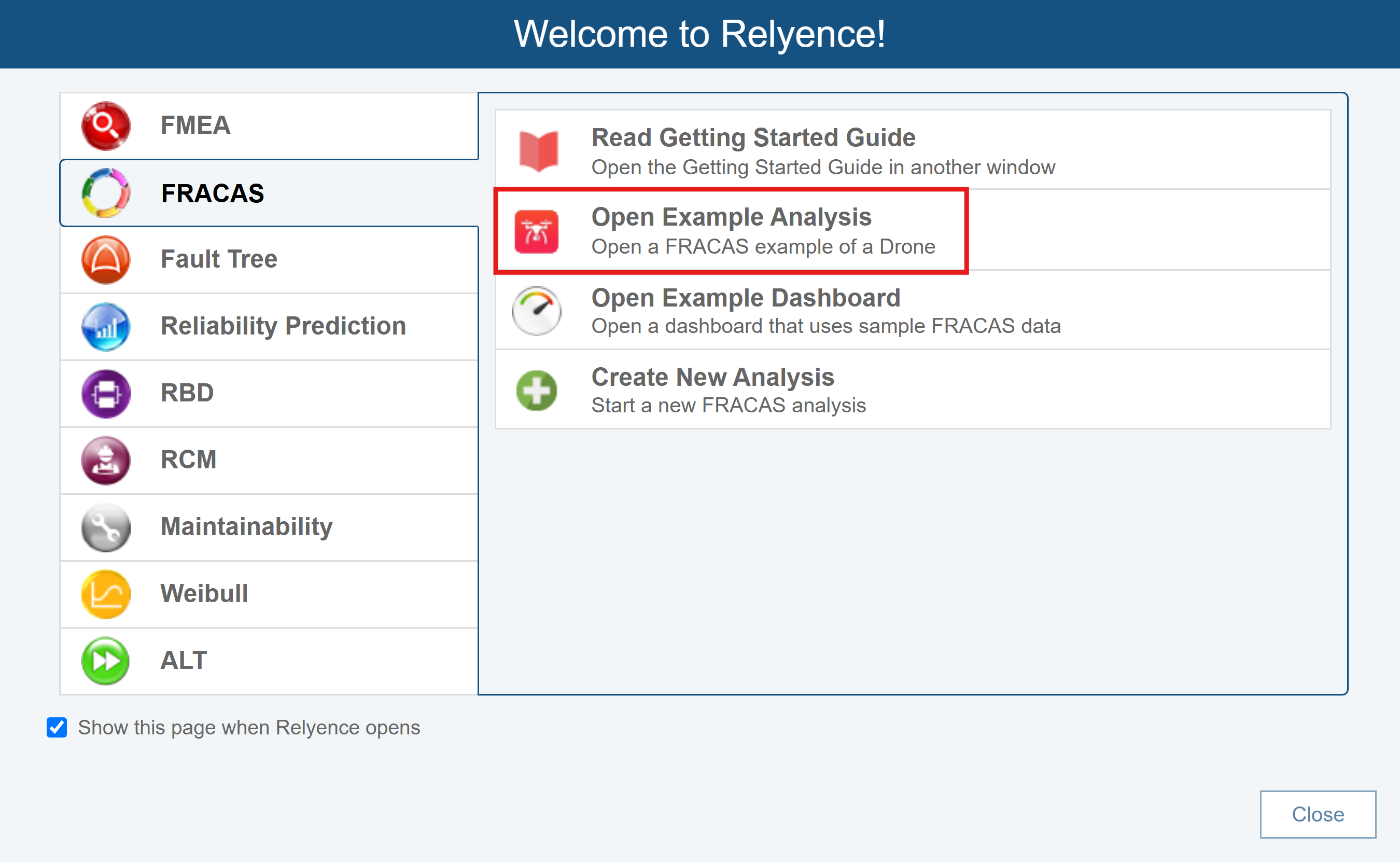Click the FRACAS tab on the left to activate Relyence FRACAS. Then click Open Example Analysis.