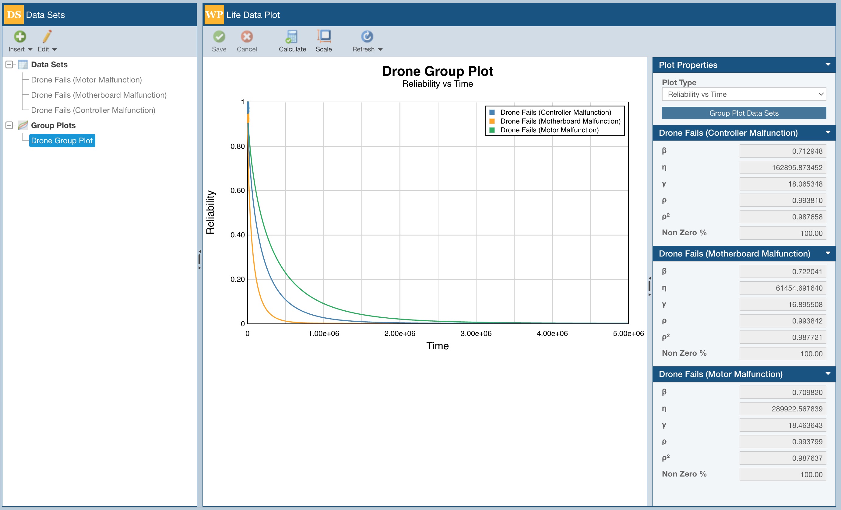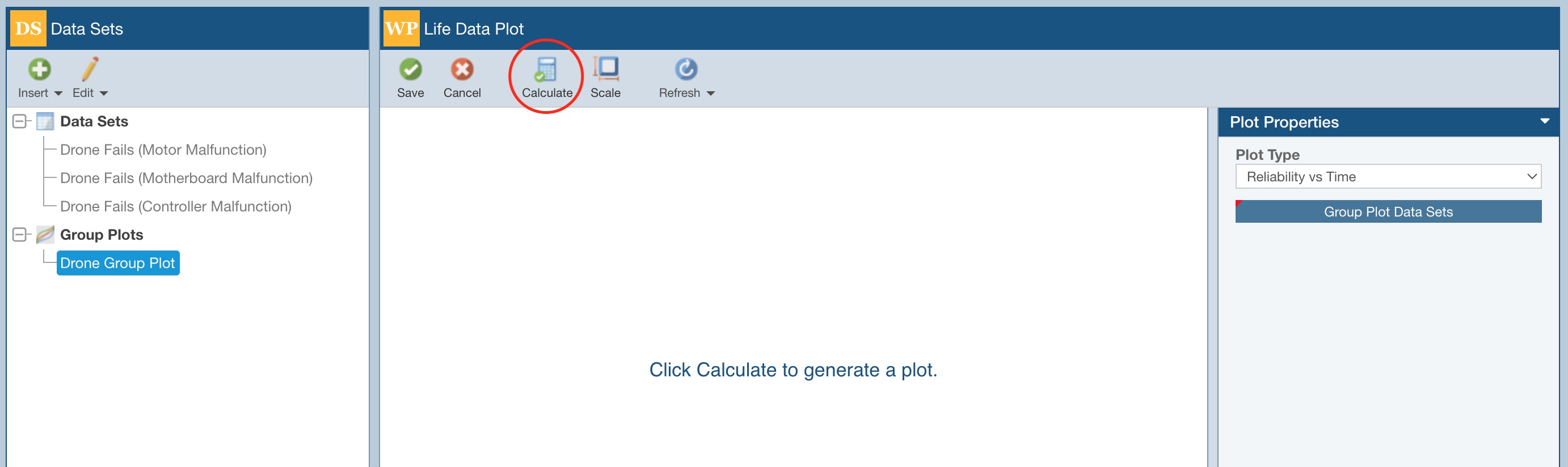 If you need to review multiple Data Sets on a single plot for analysis, you can create a Group Plot and add the Data Sets to it. A Group Plot can show up to five Life Data Sets.