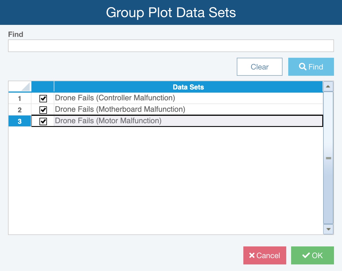 Identify the Data Sets you want to include on the Group Plot. Use the Find function, if needed.