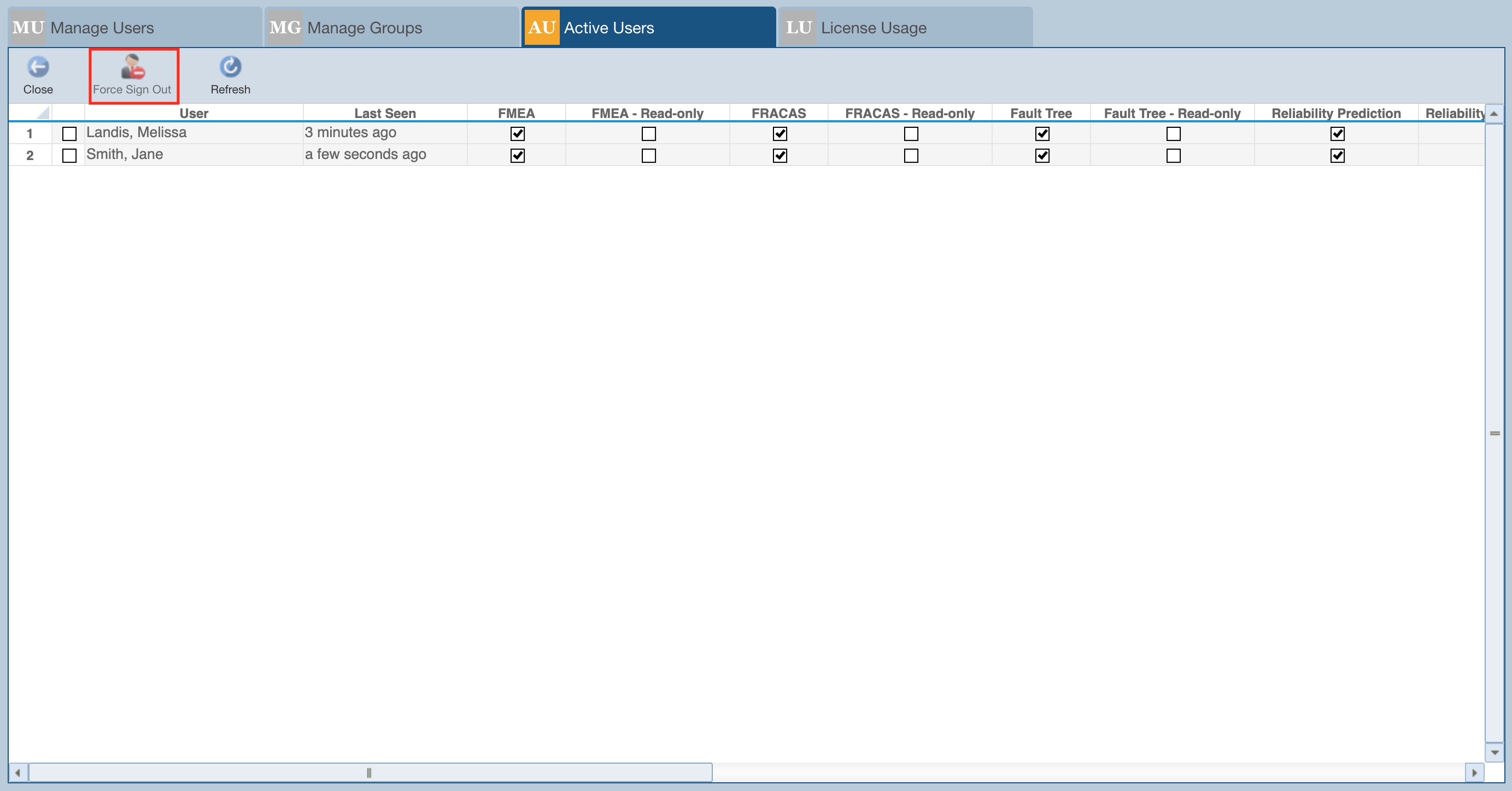 The Force Sign Out function can be used to forcibly sign a user out of Relyence. For example, if your Relyence license only allows two Fault Tree users and two users are signed in, the third person who attempts to sign in with a Fault Tree license will not be allowed access. You can view the list of active Fault Tree users and use the Force Sign Out function to force one of the two Fault Tree users out of Relyence. That Fault Tree license will then be freed up to be used by another user.