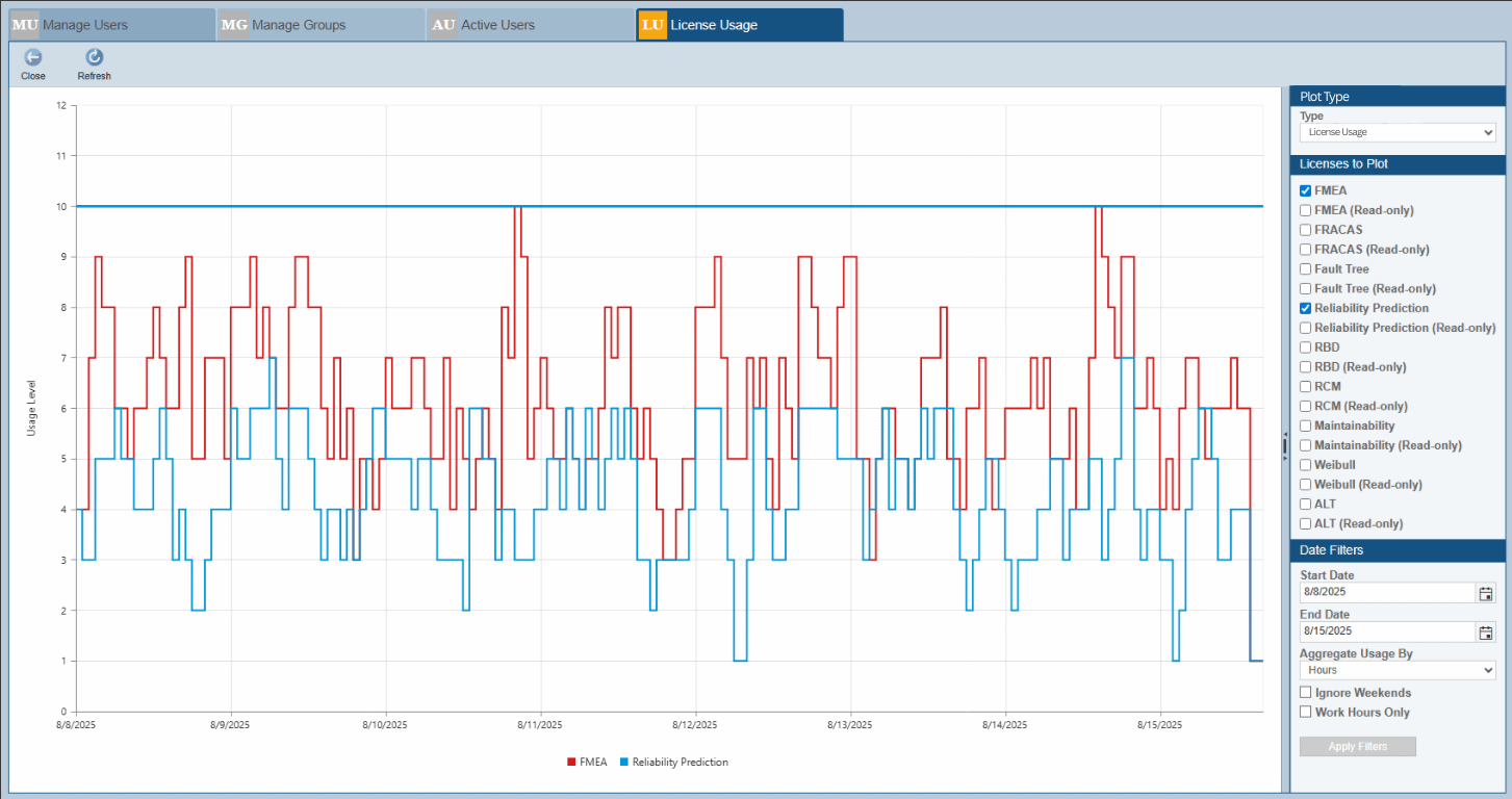The License Usage plot shows the usage levels for different Relyence licenses. You can choose the Licenses to Plot and Date Filters.