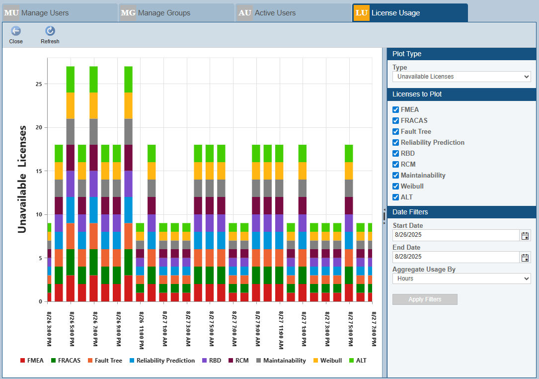 The Unavailable Licenses plot shows a stacked bar chart to highlight instances where a User could not log in at all, or was logged in with less than all requested licenses. You can choose the Licenses to Plot and Date Filters.