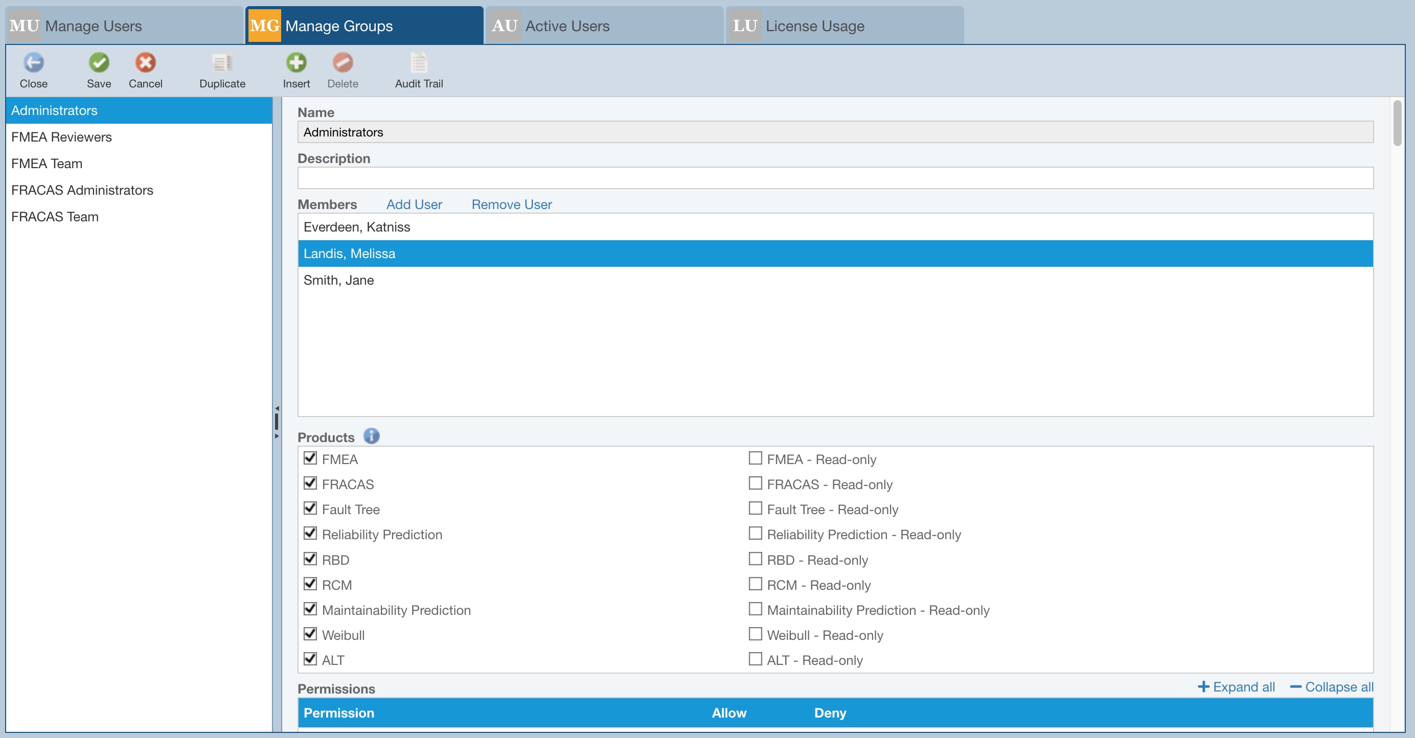 Permissions are used to establish the set of functions your Groups can use. For example, if you have defined a "FRACAS Team", perhaps you do not want those in that Group to be able to customize the FRACAS Forms and Fields; you want to maintain these as Administrator-only functions. In that case you would set the Group permission Customize Form and Fields to Deny.