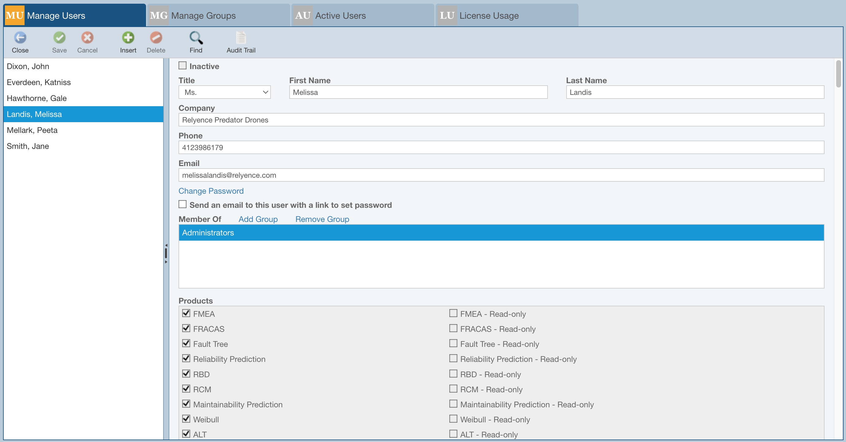 The Manage Users and Groups function enables you to control your team members who can use Relyence as well as their access to Relyence Products and functions.