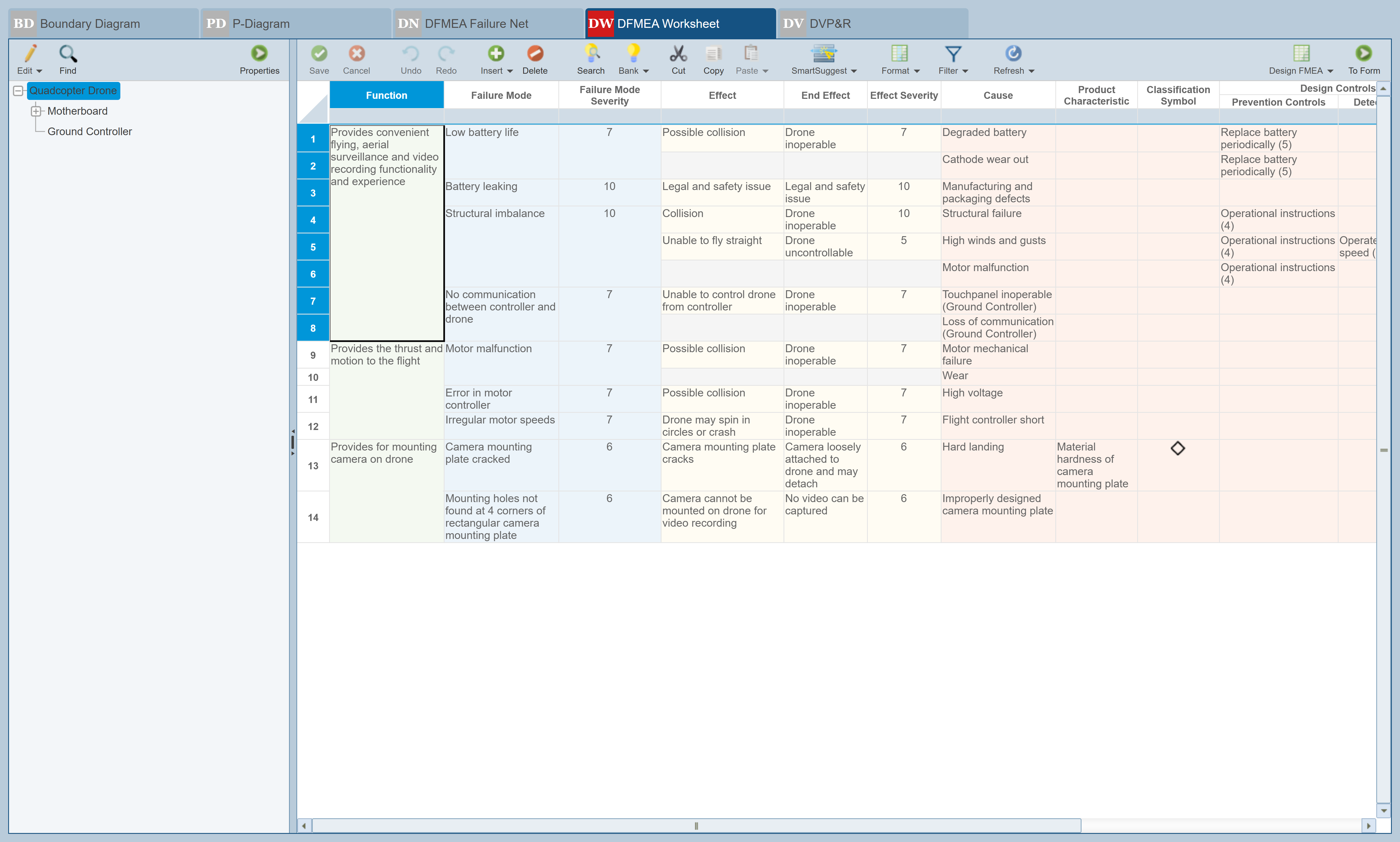 Once any desired Boundary Diagrams, P-Diagrams, Function Nets and Failure Nets are completed, you move on to the DFMEA Worksheet. The DFMEA is where you consider all potential failure modes, and their effects, causes, and actions.