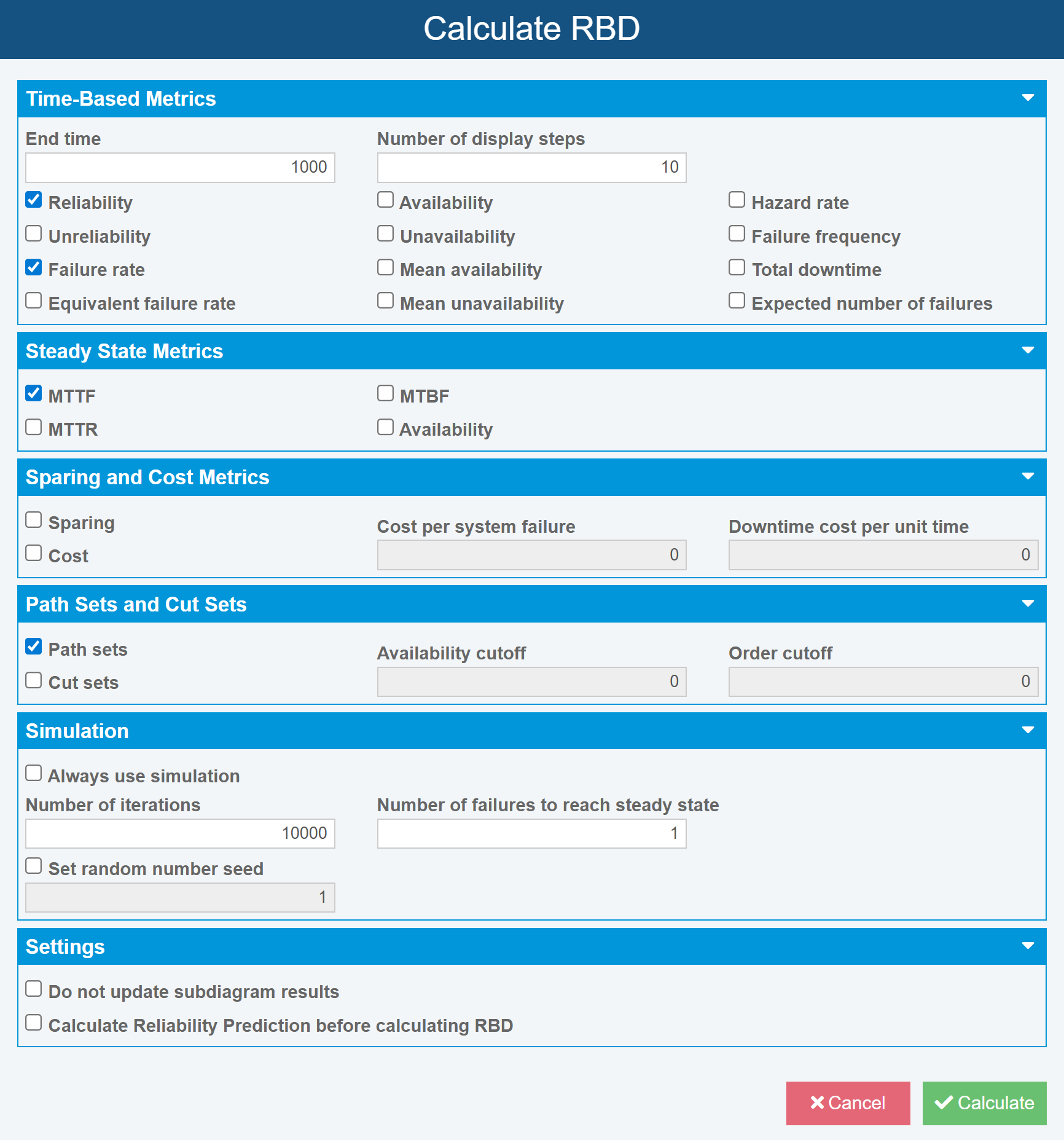Once your RBD is complete, you can calculate the reliability, availability, sparing and cost metrics by clicking Calculate from the Sidebar. The Calculate RBD dialog is shown to allow you to select the options you prefer.