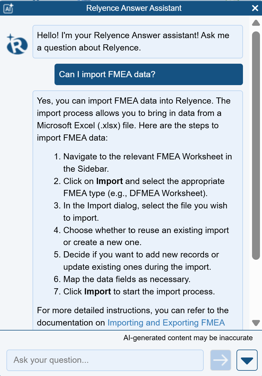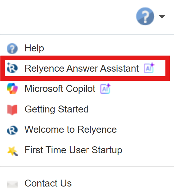 Using the Relyence Answer Assistant, you can ask a question and have it search the Relyence Help and other Relyence resources and return a detailed summary.