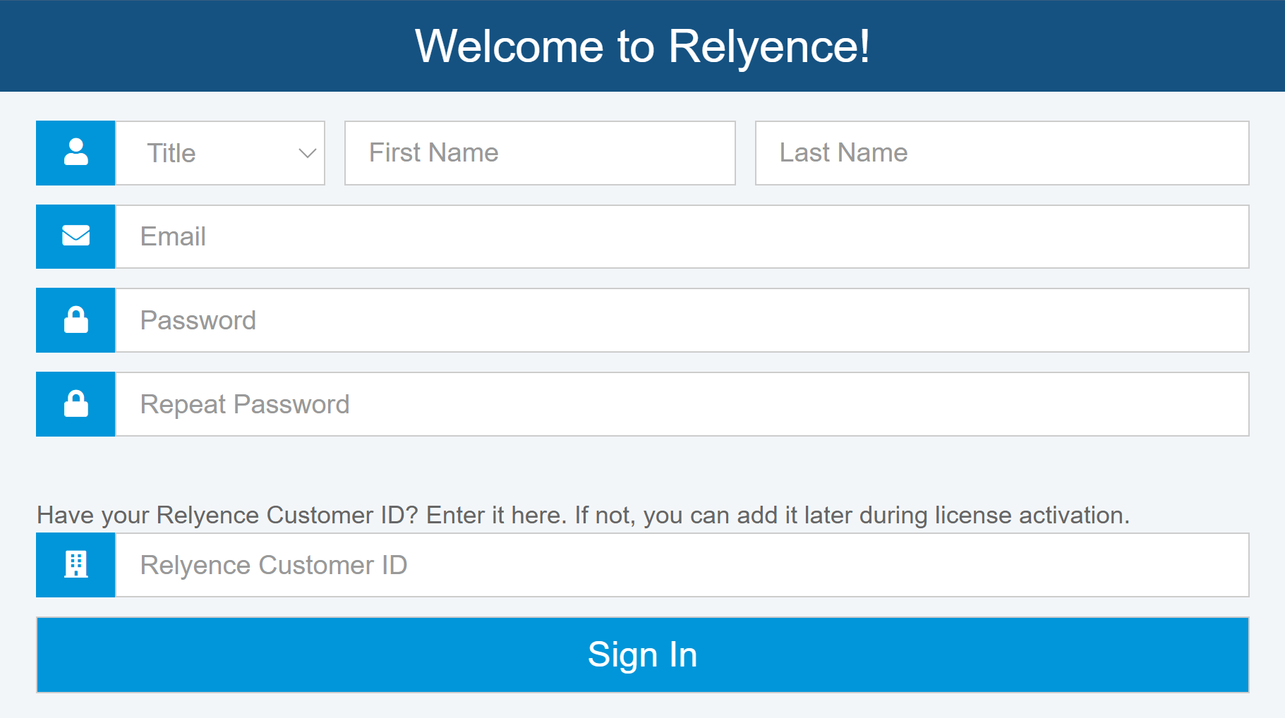 Included with your installation instructions is your Relyence Customer ID, which should be entered in the Relyence Customer ID field just above the Sign In button. This information will be used for automatic license activation in the next step.