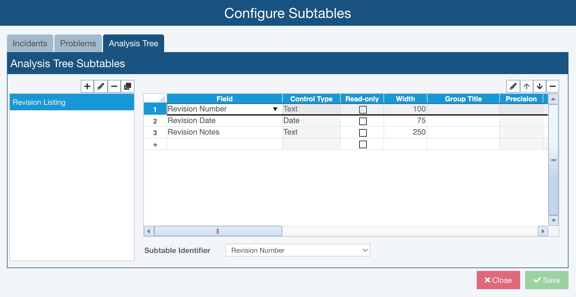 Subtables can be used for any purpose, such as documenting team members who attended a meeting, a list of steps taken, a list of parts replaced, revision listing details, or any other type of data you want to enter for an Analysis Tree item (system or subsystem).