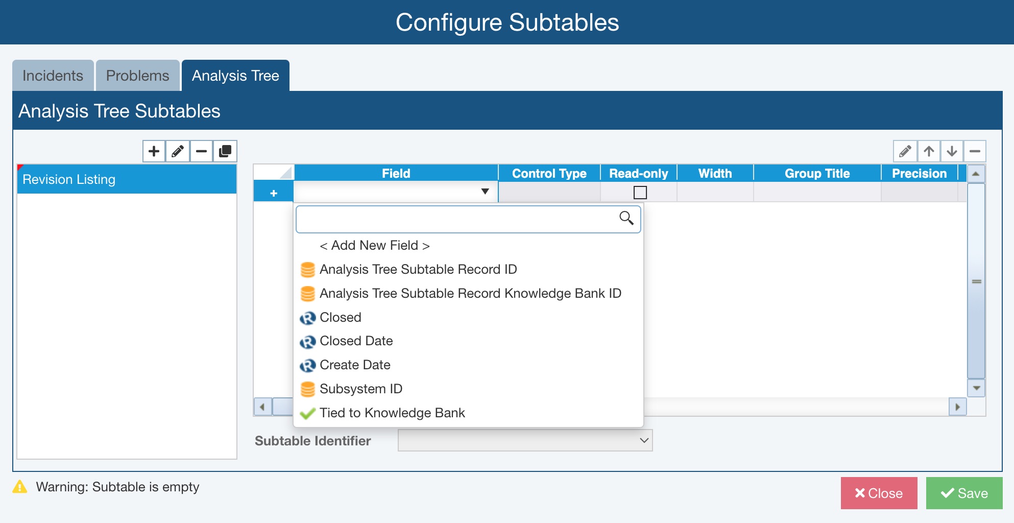 Note: You can also add Subtables to your Incident and/or Problem Forms. Details for customizing Incident and Problem Form Subtables can be found here: Using Subtables on Incident and Problem Forms.