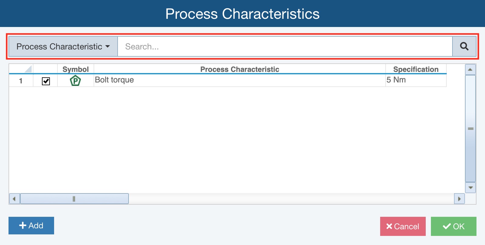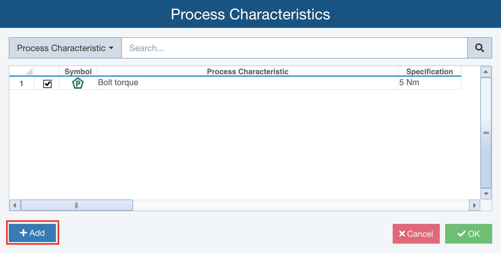 If the Process Characteristic of interest is not found in the table, you can add it by using the Add button.