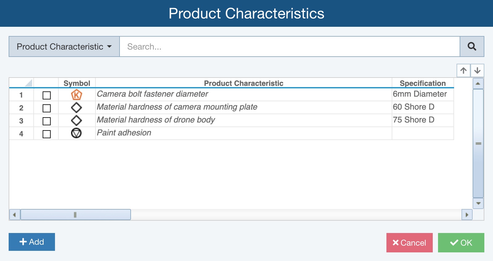 If you cannot locate the Product Characteristic of interest, you can enter text in the Search field at the top of the dialog and click the Search button.