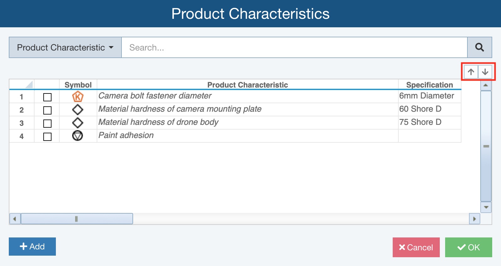 Note that you can also select any selected Product Characteristic and use the Move Up and Move Down arrows just above the table to reorder the Product Characteristics in the table.