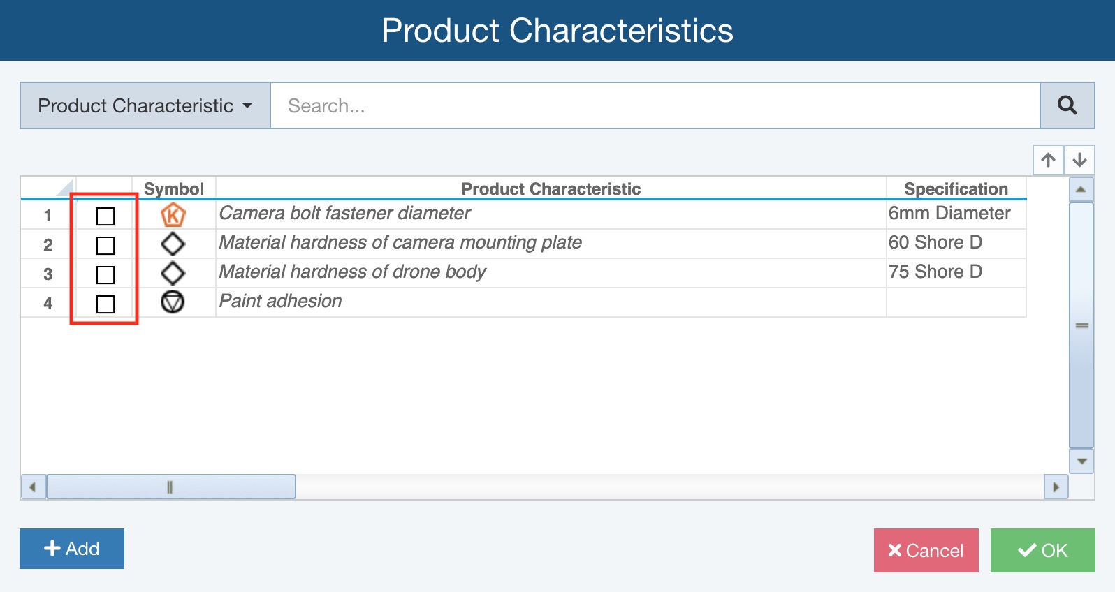 To select one or more Product Characteristics for the Cause, click the checkbox in the left-most column for all applicable Product Characteristics.