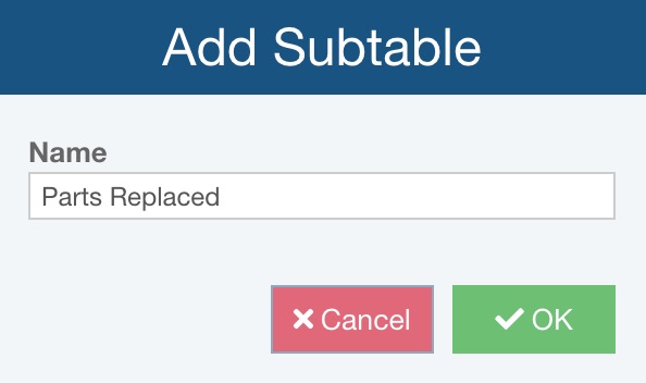 Subtable Names must be unique. The Subtable Name will appear as the title of your Subtable on your FRACAS Form.