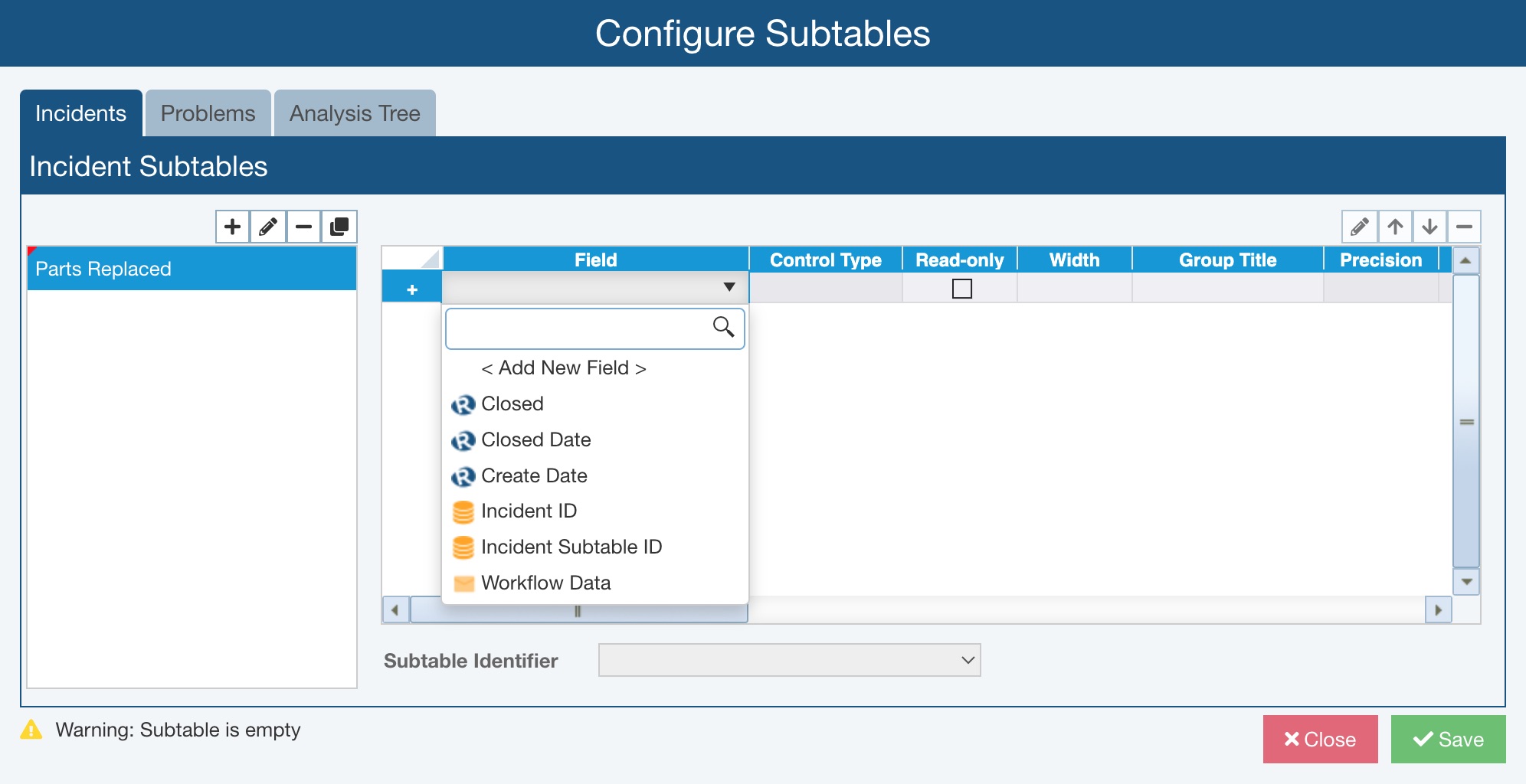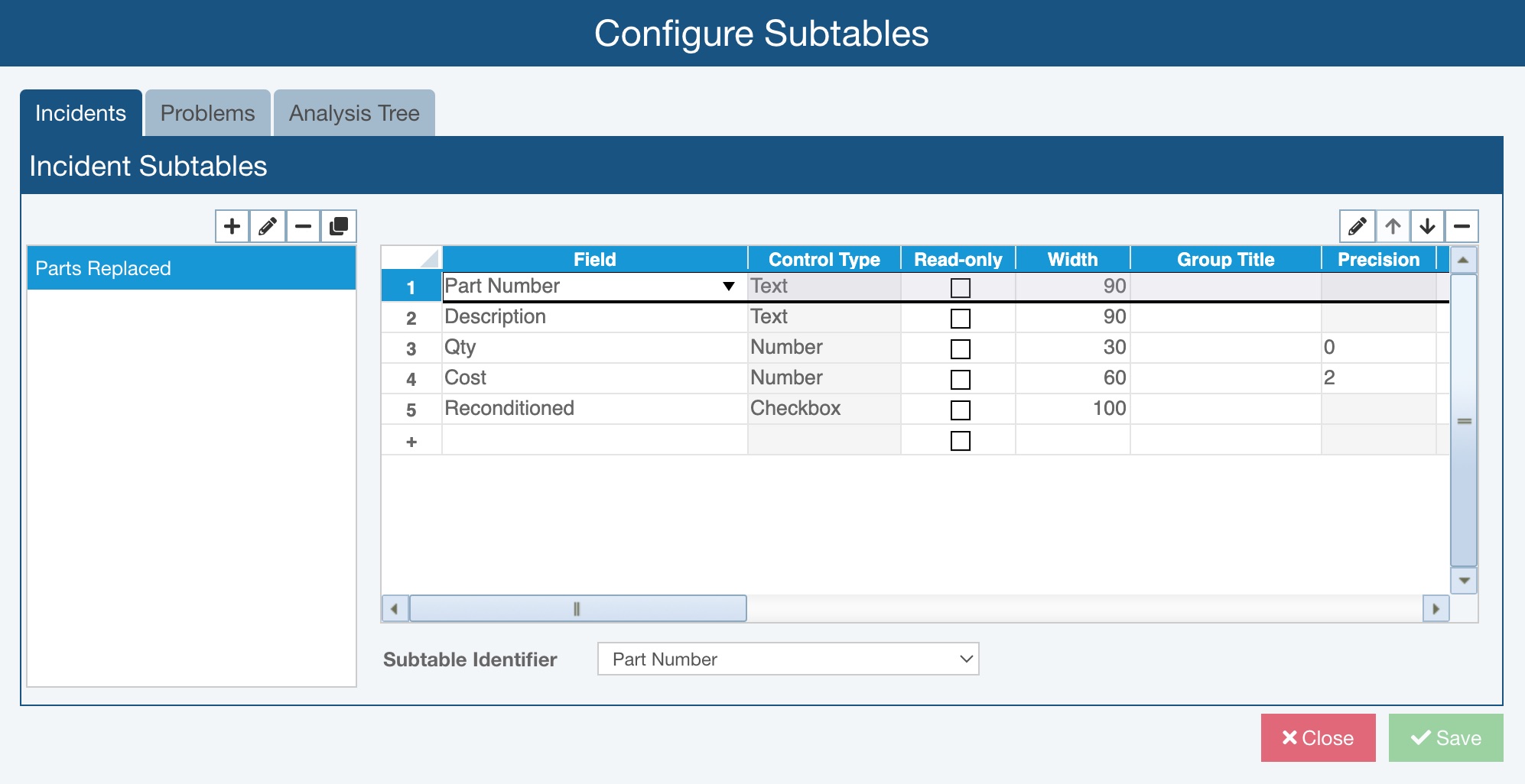 This topic focuses on customizing Subtables for use on Incident and/or Problem Forms in Relyence FRACAS.