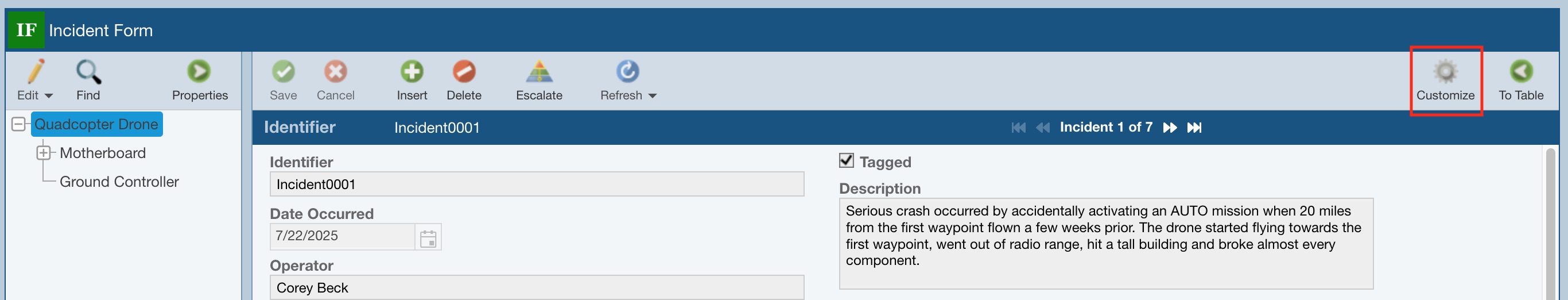 Once you have defined and configured your Subtables, the next step is to place the Subtable on your FRACAS Form. To add a Subtable on a FRACAS Form, you use the Customize feature. Complete details about customizing FRACAS Forms can be found in the Customizing the FRACAS Interface topic. For this topic, we will cover only the steps needed in order to add Subtables to FRACAS Forms.
