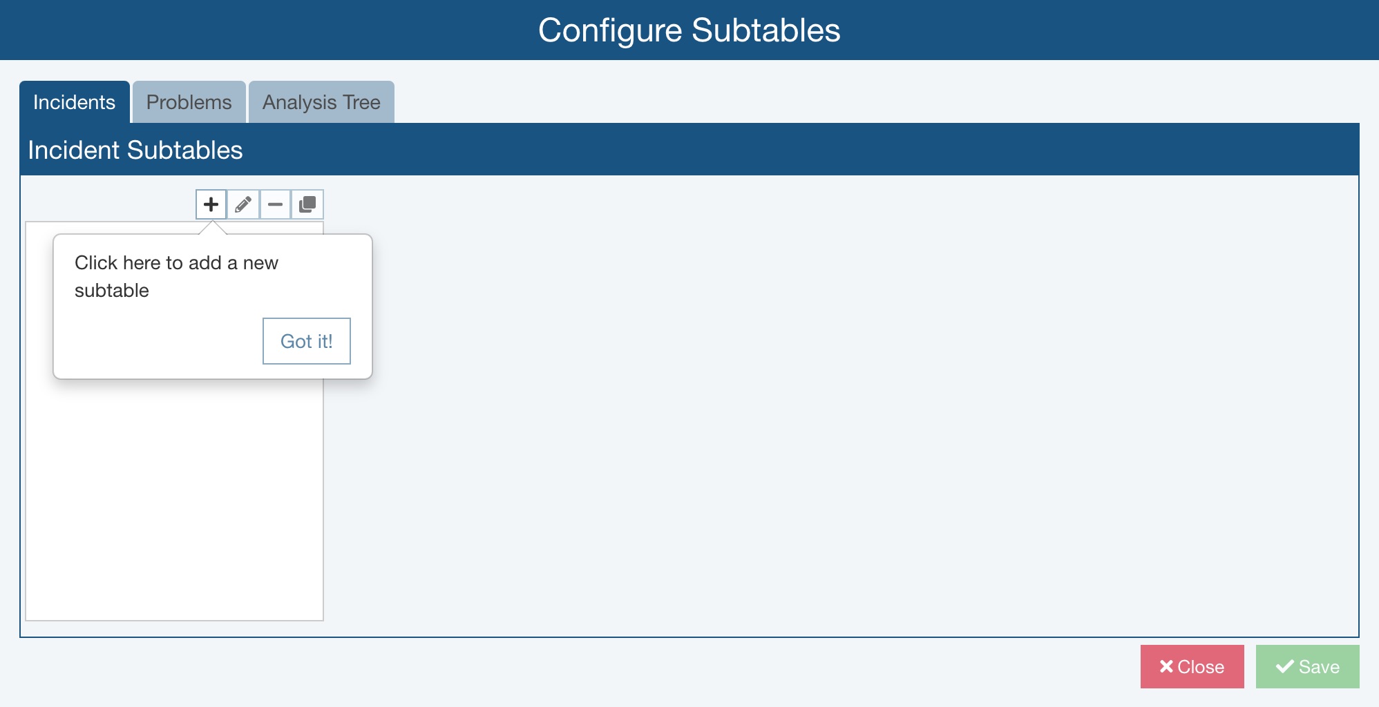 Note: This topic defines details for setting up Subtables for Incidents and Problems. For details on setting up Analysis Tree Subtables via the Analysis Tree tab, see Using Analysis Tree Subtables in Relyence FRACAS.