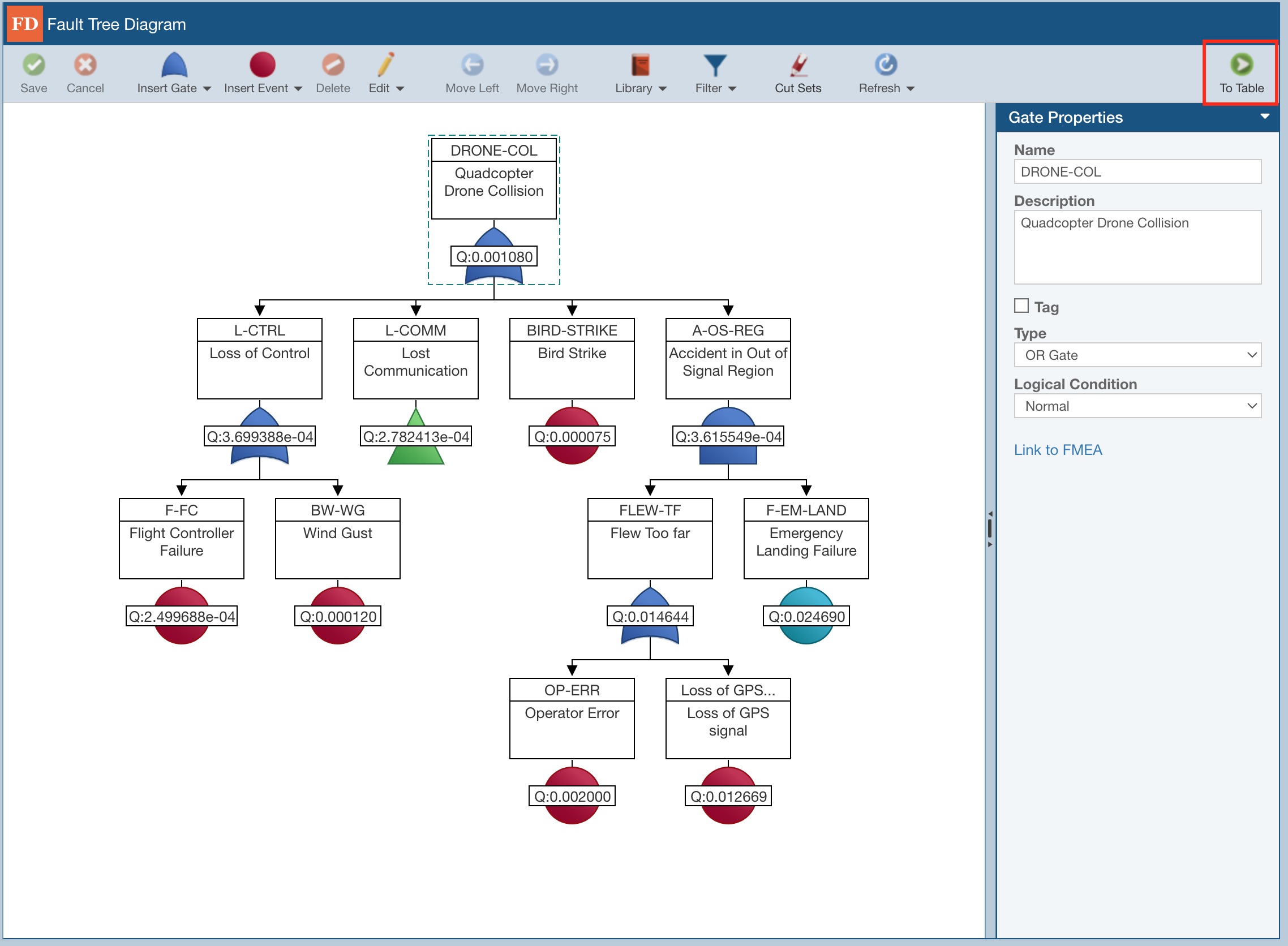 You can see the Fault Tree data for the selected Fault Tree in a table form by clicking To Table.