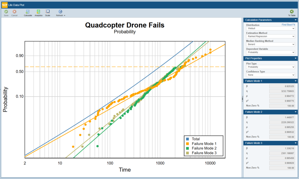 Products often experience multiple failure mechanisms, each with its own life distribution. If you combine all failures into a single data set, you may lose visibility into which failure mode is driving reliability issues. This is where Competing Failure Mode (CFM) analysis comes in. With CFM in Relyence Weibull, you can model up to five distinct failure modes independently. Simply enable the Calculate Competing Failure Modes option, assign Group Names to each data point, and map them to specific failure modes. This allows you to visualize both individual and combined failure behavior, leading to more focused and effective reliability improvements.